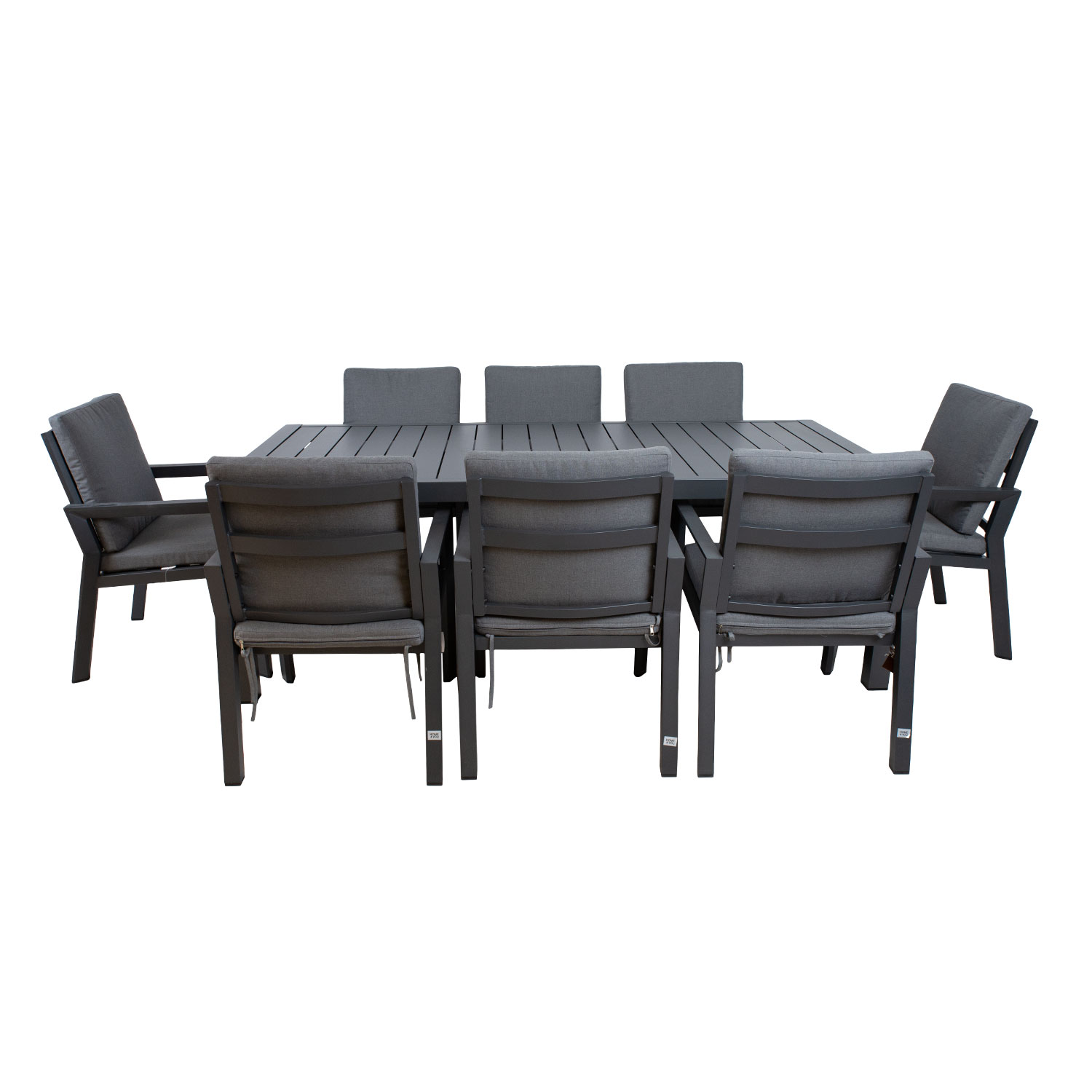 Sodo baldų komplektas TOMSON stalas ir 8 kėdės. Stalo matmenys 216x100xH73 cm. Stalo stalviršis ir kojos, taip pat kėdžių kojos ir rėmas pagaminti iš aliuminio ir nudažyti tamsiai pilkais milteliniais dažais. Į komplektą įeina kėdžių sėdynių pagalvėlės. Pagalvėlės pagamintos iš pilko olefino audinio. Užvalkalus galima nuimti ir skalbti. Sėdimosios pagalvėlės matmenys 51x54xH5 cm, atlošo pagalvėlės matmenys 51x48x4 cm. Bendrieji kėdės matmenys yra 61,5x68xH85 cm. Sėdynės plotis 51 cm, sėdynės gylis 45 cm, sėdynės aukštis su pagalve 47 cm, porankio aukštis nuo žemės 63,5 cm. Ribinis svoris 120 kg. Gaminys yra labai patvarus kintamomis oro sąlygomis ir lengvai prižiūrimas. Tik pagalvėles reikia apsaugoti nuo atmosferos poveikio. PRIEŽIŪRA: pasibaigus vasaros sezonui rekomenduojame sodo baldus laikyti patalpoje. Pasibaigus vasaros sezonui, sodo baldus reikėtų laikyti namuose. Sandėliavimui naudokite sausą ir gerai vėdinamą patalpą.