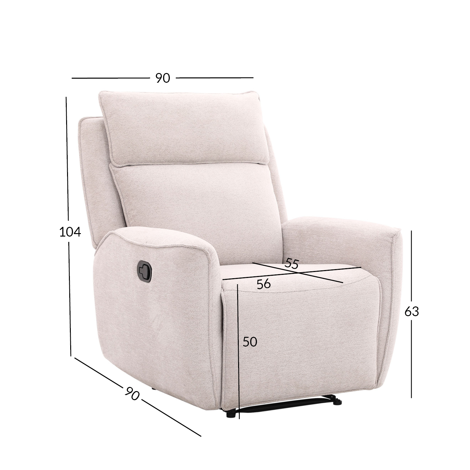 The overall dimensions of the armchair are 90x90xH104cm. Seat width 56cm, seat depth 55cm, seat height 50cm. Armrest height from the ground 63cm.