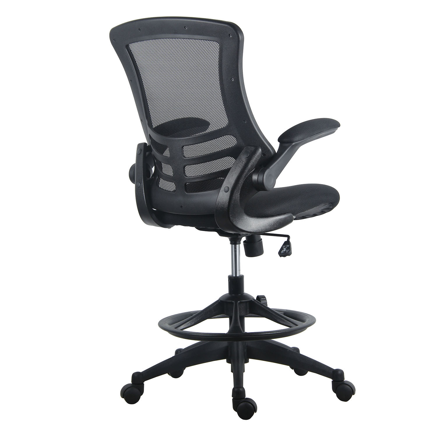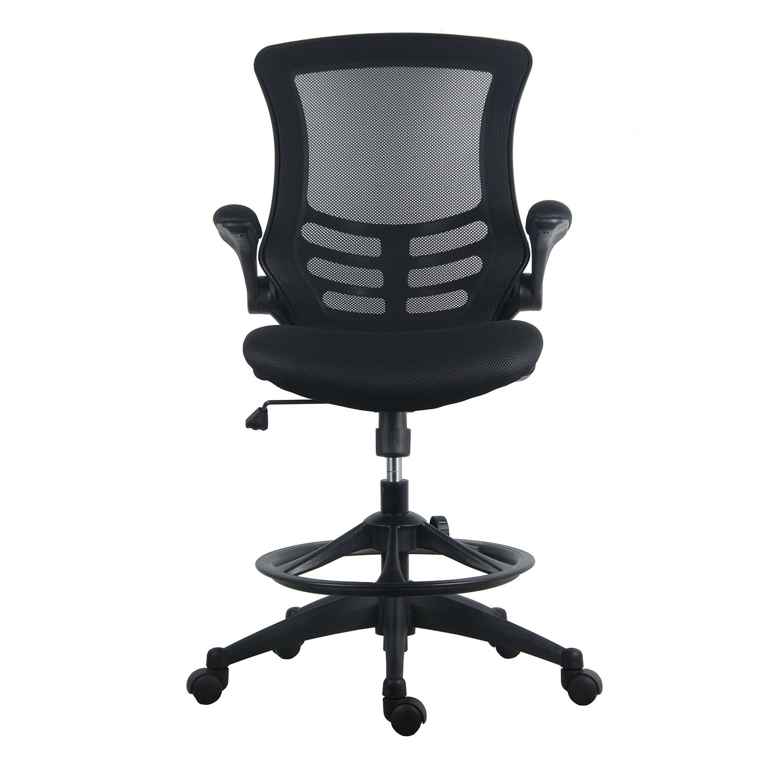Aukšta darbo kėdė TRIBECCA juoda. Sėdynė aptraukta poliesterio audiniu, atlošas – poliesterio tinkleliu. Sukamasis mechanizmas. Sėdynės aukštis reguliuojamas droseliais. Porankiai su minkštu apmušalų audiniu gali būti pakeliami. Reguliuojamo aukščio kojų atrama. Penkių rankų juodos spalvos plastikinis kojų atrama, patvarūs guminiai ratukai. Kėdės aukštis 109-128,5 cm, sėdynės aukštis 57-76,5 cm, atlošo aukštis 54 cm. Gaminio matmenys 62,5x62xH109-128,5 cm. Kėdės svorio riba 110 kg.