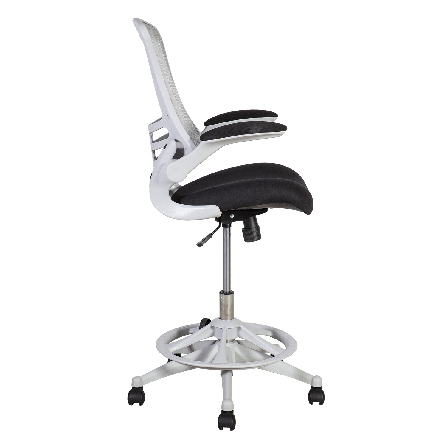 Aukšta darbo kėdė TRIBECCA pilka. Sėdynė aptraukta poliesterio audiniu, atlošas – poliesterio tinkleliu. Kėdė su sukamuoju mechanizmu. Sėdynės aukštis reguliuojamas droseliais. Porankius, aptrauktus minkštu apmušalų audiniu, galima pakelti. Reguliuojamo aukščio kojų atrama. Penkių porankių šviesiai pilkos spalvos plastikinė kojų atrama, plastikiniai ratukai. Kėdės aukštis 109-128,5 cm. Gaminio matmenys 62,5x62xH109-128,5 cm. Kėdės svorio riba 110 kg.