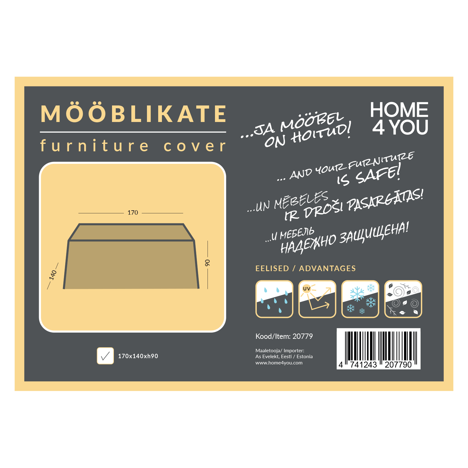Baldų dangtis 170x140x90 cm, atsparus oro sąlygoms. Išsaugo sodo baldus švarius, sausus ir visada paruoštus naudoti. Pagamintas iš vandeniui atsparaus laminuoto poliesterio audinio. Užklijuotos siūlės apsaugo nuo vandens prasiskverbimo, o ventiliacijos angos sumažina po dangčiu susidariusį kondensatą. Apatiniame dangčio krašte yra virvelė, kuria prireikus galima patraukti dangtį ir jį pritvirtinti taip, kad jis išliktų savo vietoje net pučiant stipriam vėjui. Techninės laikmenos savybės: svoris 155±8 g/m², storis >0,20 mm, atsparumas vandeniui ? 6000 mm, atsparumas vandeniui 4, spalvos atsparumas šviesai 6, apsauga nuo UV spindulių 600 ± 5 valandų, pralaidumas orui 150-200 g/m²/24h, atsparumas temperatūrai nuo -30 iki +80 °C, atsparumas vandeniui 4, spalvos atsparumas orui 6, apsauga nuo UV spindulių 600 ± 5 valandų, pralaidumas orui 150-200 g/m²/24h, atsparumas temperatūrai nuo -30 iki +80 °C. DĖMESIO! Baldų danga padeda prailginti baldų tarnavimo laiką ir yra saugi lauko baldų apsauga, tačiau negarantuoja tokių pat sąlygų, kaip laikymo patalpose. Esant stipriam lietui, ant baldų, uždengtų užvalkalu, gali kauptis vandens kondensatas. Kuo greičiau pašalinkite susikaupusį vandenį. Dangtį skalbkite pagal prie gaminio pridėtus priežiūros nurodymus. Baldų dangčio naudojimas nėra tinkamas sprendimas sodo baldams laikyti lauke žiemą.