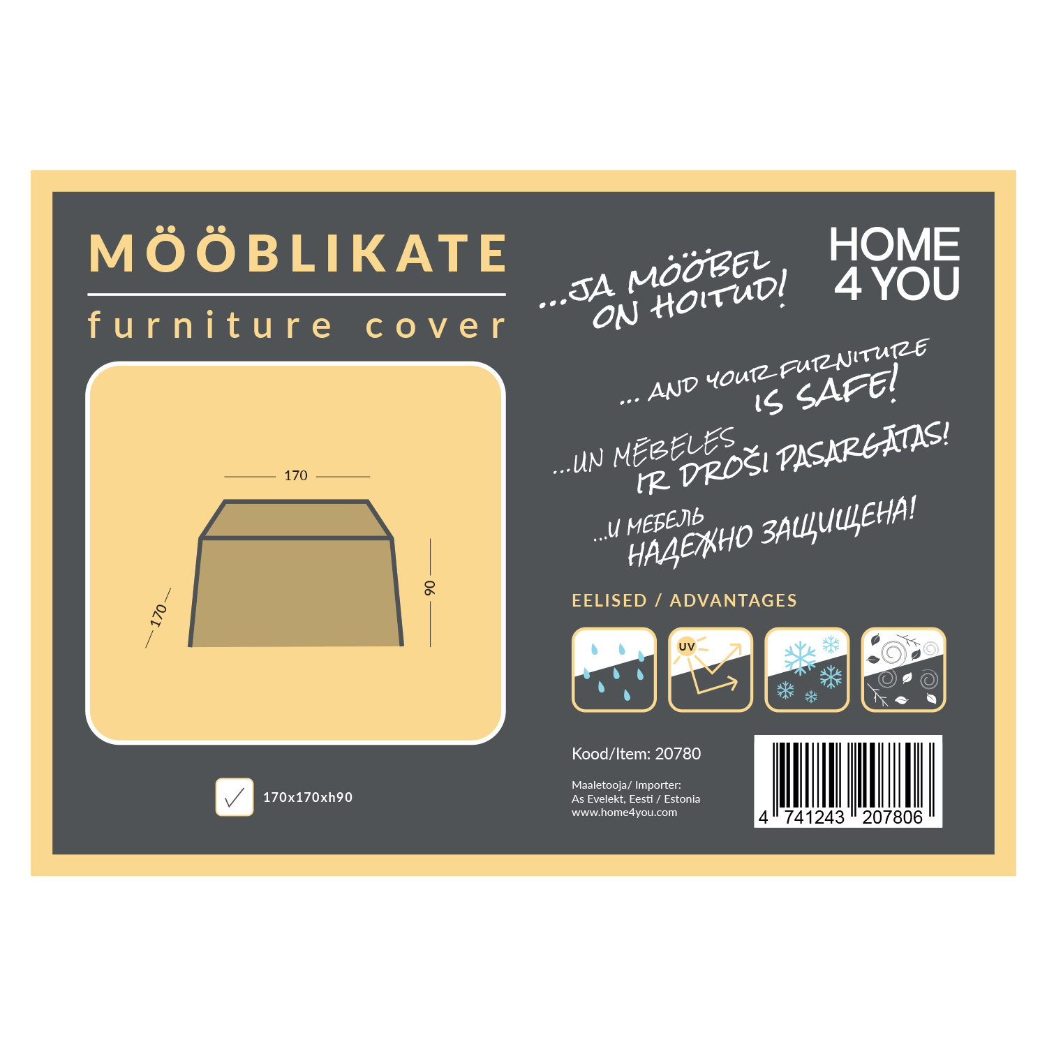 Baldų dangtis 170x170x90 cm, atsparus oro sąlygoms. Išsaugo sodo baldus švarius ir sausus bei visada paruoštus naudoti. Pagamintas iš vandeniui atsparaus laminuoto poliesterio audinio. Užklijuotos siūlės apsaugo nuo vandens prasiskverbimo, o ventiliacijos angos sumažina kondensaciją po užvalkalu. Apatiniame dangčio krašte yra virvelė, kuria prireikus galima patraukti dangtį ir jį pritvirtinti taip, kad jis išliktų savo vietoje net pučiant stipriam vėjui. Techninės laikmenos savybės: svoris 155±8 g/m², storis >0,20 mm, atsparumas vandeniui ? 6000 mm, atsparumas vandeniui 4, spalvos atsparumas šviesai 6, apsauga nuo UV spindulių 600 ± 5 valandų, pralaidumas orui 150-200 g/m²/24h, atsparumas temperatūrai nuo -30 iki +80 °C, atsparumas vandeniui 4, spalvos atsparumas orui 6, apsauga nuo UV spindulių 600 ± 5 valandų, pralaidumas orui 150-200 g/m²/24h, atsparumas temperatūrai nuo -30 iki +80 °C. DĖMESIO! Baldų danga padeda prailginti baldų tarnavimo laiką ir yra saugi lauko baldų apsauga, tačiau negarantuoja tokių pat sąlygų, kaip laikymo patalpose. Esant stipriam lietui, ant baldų, uždengtų užvalkalu, gali kauptis vandens kondensatas. Kuo greičiau pašalinkite susikaupusį vandenį. Dangtį skalbkite pagal prie gaminio pridėtus priežiūros nurodymus. Baldų dangčio naudojimas nėra tinkamas sprendimas sodo baldams laikyti lauke žiemą.