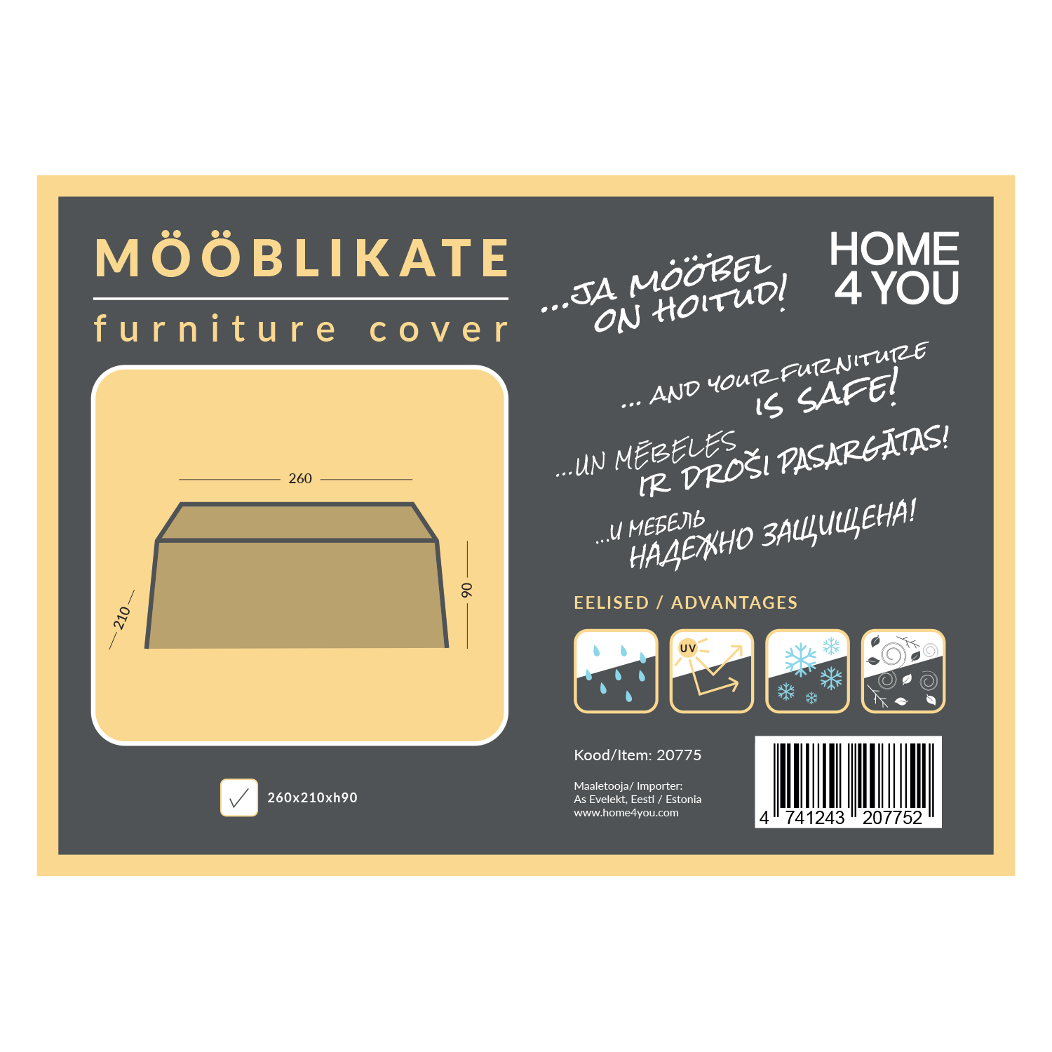 Baldų dangtis 260x210x90 cm, atsparus oro sąlygoms. Išsaugo jūsų sodo baldus švarius, sausus ir visada paruoštus naudoti. Pagamintas iš vandeniui atsparaus laminuoto poliesterio audinio. Užklijuotos siūlės apsaugo nuo vandens patekimo, o vėdinimo angos sumažina po dangčiu susidariusį kondensatą. Apatiniame dangčio krašte yra virvelė, kuria prireikus galima patraukti dangtį ir jį pritvirtinti taip, kad jis išliktų savo vietoje net pučiant stipriam vėjui. Techninės laikmenos savybės: svoris 155±8 g/m², storis >0,20 mm, atsparumas vandeniui ? 6000 mm, atsparumas vandeniui 4, spalvos atsparumas šviesai 6, apsauga nuo UV spindulių 600 ± 5 valandų, pralaidumas orui 150-200 g/m²/24h, atsparumas temperatūrai nuo -30 iki +80 °C, atsparumas vandeniui 4, spalvos atsparumas orui 6, apsauga nuo UV spindulių 600 ± 5 valandų, pralaidumas orui 150-200 g/m²/24h, atsparumas temperatūrai nuo -30 iki +80 °C. DĖMESIO! Baldų danga padeda prailginti baldų tarnavimo laiką ir yra saugi lauko baldų apsauga, tačiau negarantuoja tokių pat sąlygų, kaip laikymo patalpose. Esant stipriam lietui, ant baldų, uždengtų užvalkalu, gali kauptis vandens kondensatas. Kuo greičiau pašalinkite susikaupusį vandenį. Dangtį skalbkite pagal prie gaminio pridėtus priežiūros nurodymus. Baldų dangčio naudojimas nėra tinkamas sprendimas sodo baldams laikyti lauke žiemą.