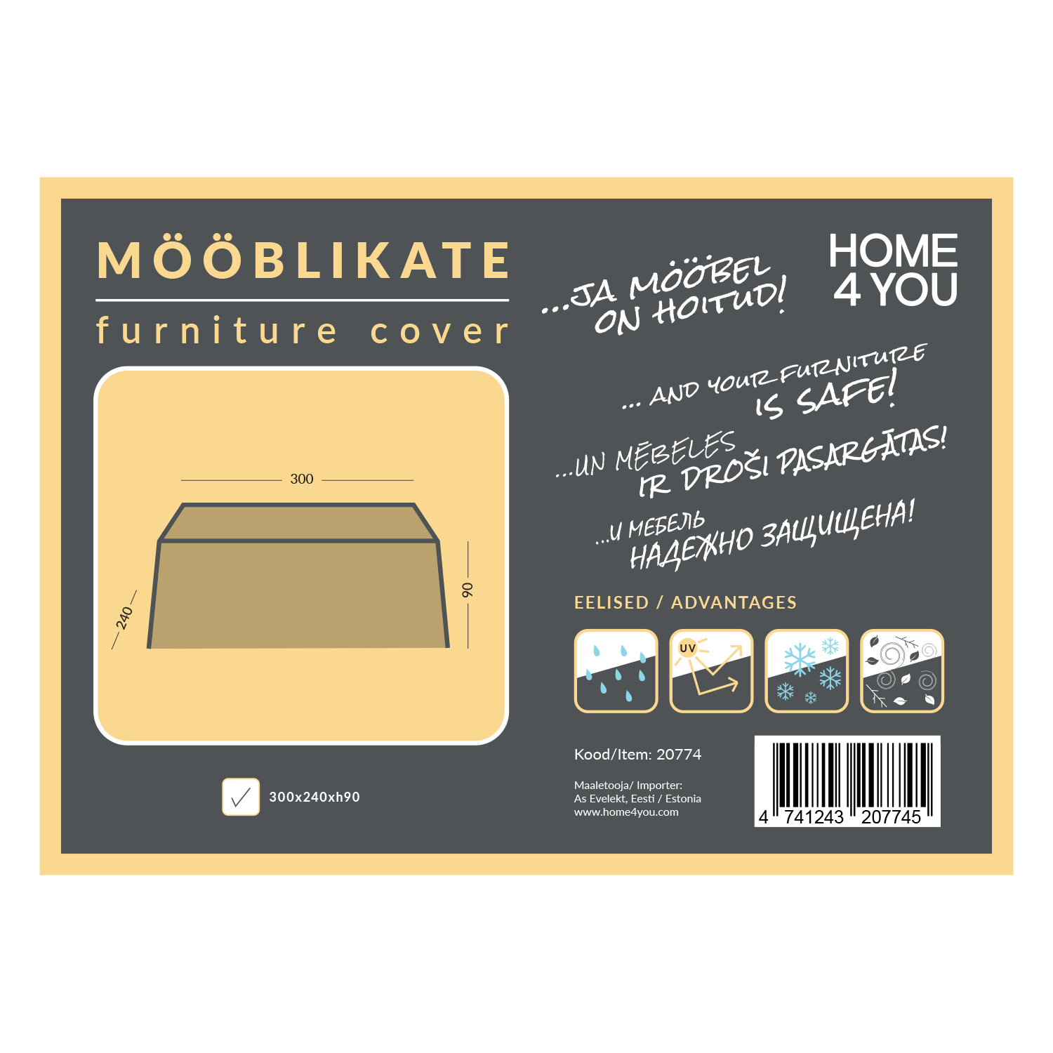 Baldų dangtis 300x240x90 cm, atsparus oro sąlygoms. Išsaugo sodo baldus švarius, sausus ir visada paruoštus naudoti. Pagamintas iš vandeniui atsparaus laminuoto poliesterio audinio. Užklijuotos siūlės apsaugo nuo vandens prasiskverbimo, o ventiliacijos angos sumažina po dangčiu susidariusį kondensatą. Apatiniame dangčio krašte yra virvelė, kuria prireikus galima patraukti dangtį ir jį pritvirtinti taip, kad jis išliktų savo vietoje net pučiant stipriam vėjui. Techninės laikmenos savybės: svoris 155±8 g/m², storis >0,20 mm, atsparumas vandeniui ? 6000 mm, atsparumas vandeniui 4, spalvos atsparumas šviesai 6, apsauga nuo UV spindulių 600 ± 5 valandų, pralaidumas orui 150-200 g/m²/24h, atsparumas temperatūrai nuo -30 iki +80 °C, atsparumas vandeniui 4, spalvos atsparumas orui 6, apsauga nuo UV spindulių 600 ± 5 valandų, pralaidumas orui 150-200 g/m²/24h, atsparumas temperatūrai nuo -30 iki +80 °C. DĖMESIO! Baldų danga padeda prailginti baldų tarnavimo laiką ir yra saugi lauko baldų apsauga, tačiau negarantuoja tokių pat sąlygų, kaip laikymo patalpose. Esant stipriam lietui, ant baldų, uždengtų užvalkalu, gali kauptis vandens kondensatas. Kuo greičiau pašalinkite susikaupusį vandenį. Dangtį skalbkite pagal prie gaminio pridėtus priežiūros nurodymus. Baldų dangčio naudojimas nėra tinkamas sprendimas sodo baldams laikyti lauke žiemą.