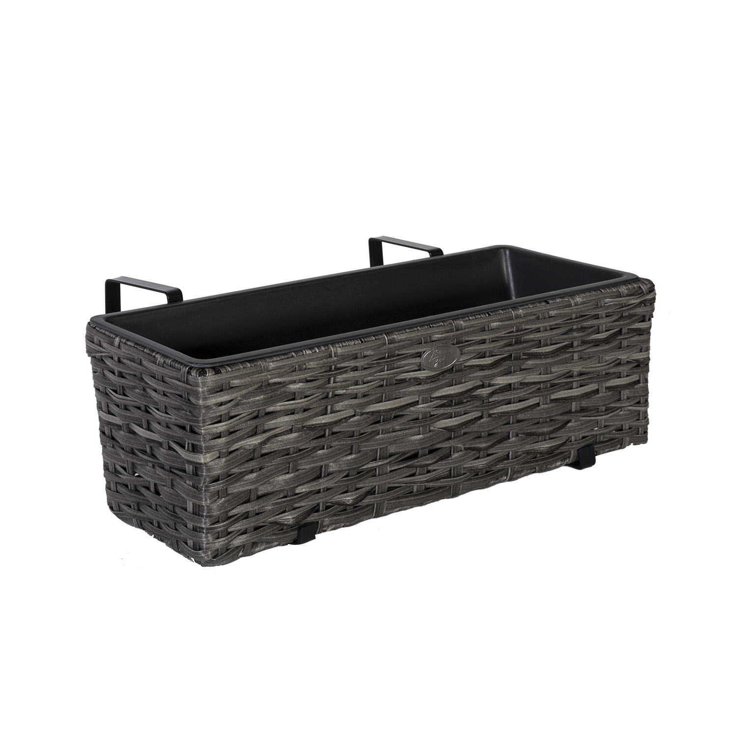 Balkoninė gėlių dėžutė WICKER 60x19xH18cm, pilka. Metalinis karkasas, aptrauktas plastikiniu pynimu. Vidinio plastikinio vazono matmenys 56×15,5xH13cm. Vidinis vazonas be skylės. Dėžutė turi du metalinius tvirtinimo spaustukus. Atstumas tarp spaustuko ir dėžutės krašto yra 8,5 cm.