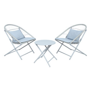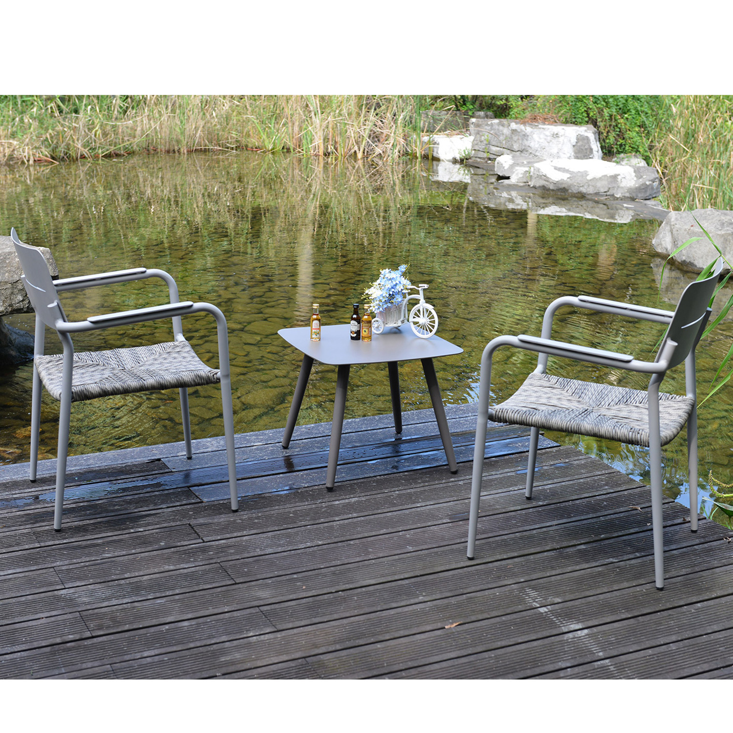 Balkono komplektas COCORA su stalu ir 2 kėdėmis. Stalo ir kėdžių rėmai, stalviršis ir kėdžių atlošai pagaminti iš aliuminio ir nudažyti pilkai smėlio spalvos milteliniais dažais. Kėdės sėdynės pagrindas aptrauktas virvės pynimu. Stalo matmenys 50x50xH42 cm, stalo stalviršio storis 4 mm. Kėdės išmatavimai 57x58xH81cm, sėdimosios dalies plotis 39cm, sėdimosios dalies gylis 49cm, sėdimosios dalies aukštis 42cm, atlošo aukštis 42cm, porankio aukštis 65cm nuo žemės. Ribinis svoris 110 kg. Kėdės gali būti kraunamos viena ant kitos. Gaminys yra patvarus kintamomis oro sąlygomis ir labai lengvai prižiūrimas. PRIEŽIŪRA: pasibaigus vasaros sezonui, rekomenduojame sodo baldus laikyti patalpoje. Vasaros sezono atveju baldus reikėtų laikyti sode. Prieš laikydami baldus išvalykite ir išdžiovinkite. Laikykite vėsioje, sausoje ir gerai vėdinamoje patalpoje.