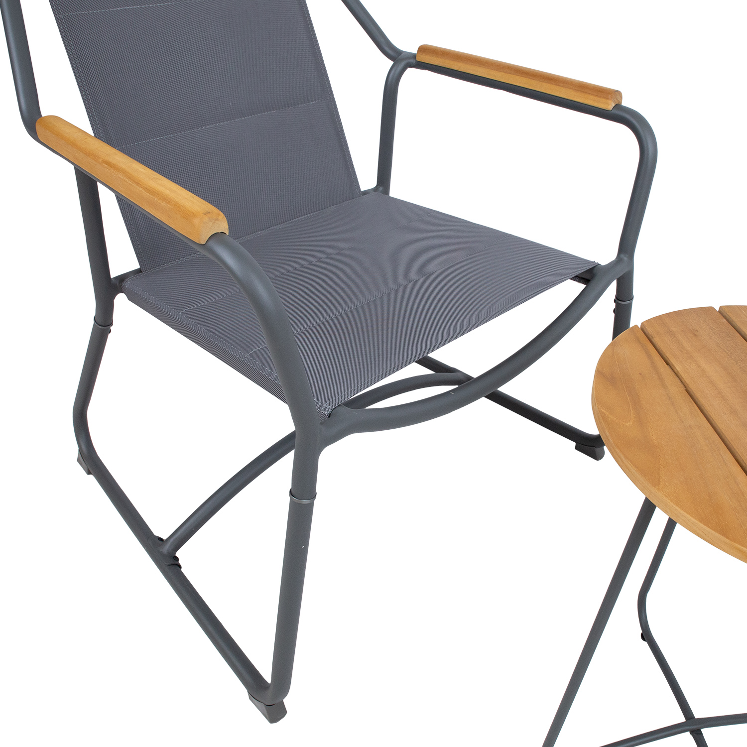 Balkono komplektas LARISA stalas ir 2 kėdės. LARISA komplektas yra patogus ir praktiškas, puikiai tinka balkonui, sodui ar pirčiai. Kėdžių ir stalo rėmai pagaminti iš aliuminio ir padengti tamsiai pilka milteline danga. Lengvo putplasčio tekstilės apmušalais aptrauktos sėdynės, greitai džiūsta ir yra lengvai valomos. Pušinis stalo stalviršis ir juostelės ant kėdžių rankenų suteikia rinkiniui išskirtinį akcentą. Stalo matmenys D40xH50 cm. Kėdės matmenys 74x75xH85 cm, svorio riba 110 kg. Naudojama FSC sertifikuota mediena. Gaminys atsparus besikeičiančioms oro sąlygoms ir labai lengvai prižiūrimas. Norėdami prailginti lauko baldų tarnavimo laiką, rekomenduojame naudoti lauko baldų užvalkalus. PRIEŽIŪRA: pasibaigus vasaros sezonui, rekomenduojame sodo baldus laikyti patalpoje. Jei vasaros sezonui, rekomenduojame palikti baldus sode žiemos mėnesiais. Laikykitės vėsioje, sausoje ir gerai vėdinamoje patalpoje.