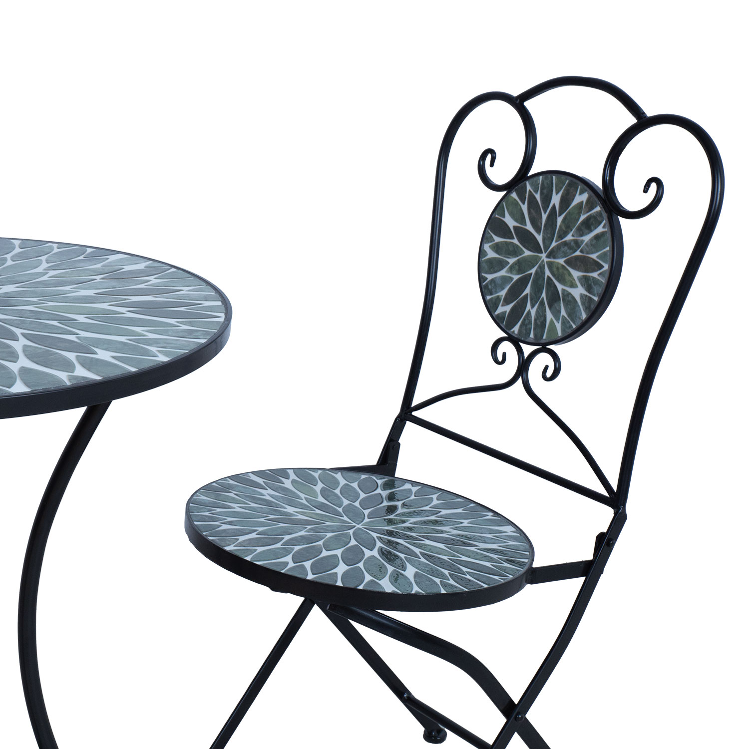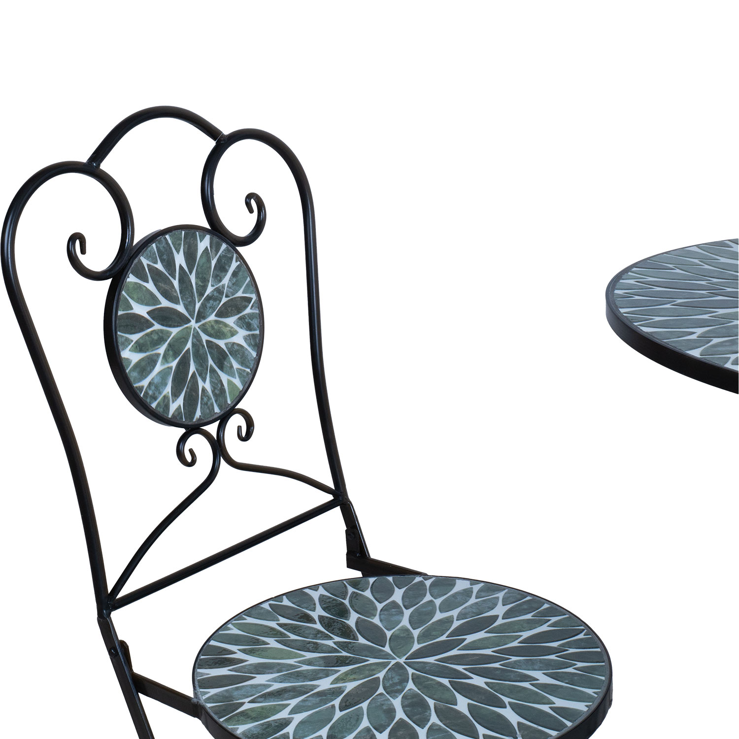 Stalo stalviršis, sulankstomų kėdžių sėdynė ir atlošas: keraminis stalviršis su žalių lapų motyvais.