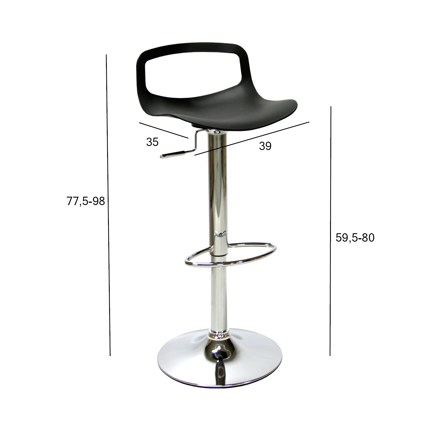 Baro kėdė ANDY 39x35xH77,5-98cm, sėdynė: plastikas, spalva: juoda, kojelė: chromas. Rėmo spalva: chromuotas. Mechanizmas ir nustatymai: sėdimosios dalies aukštis reguliuojamas droseliais. Matmenys: sėdynės aukštis 57,5-78 cm, sėdynės gylis 35 cm, sėdynės plotis 39 cm. Papildoma informacija: svorio riba 100 kg.