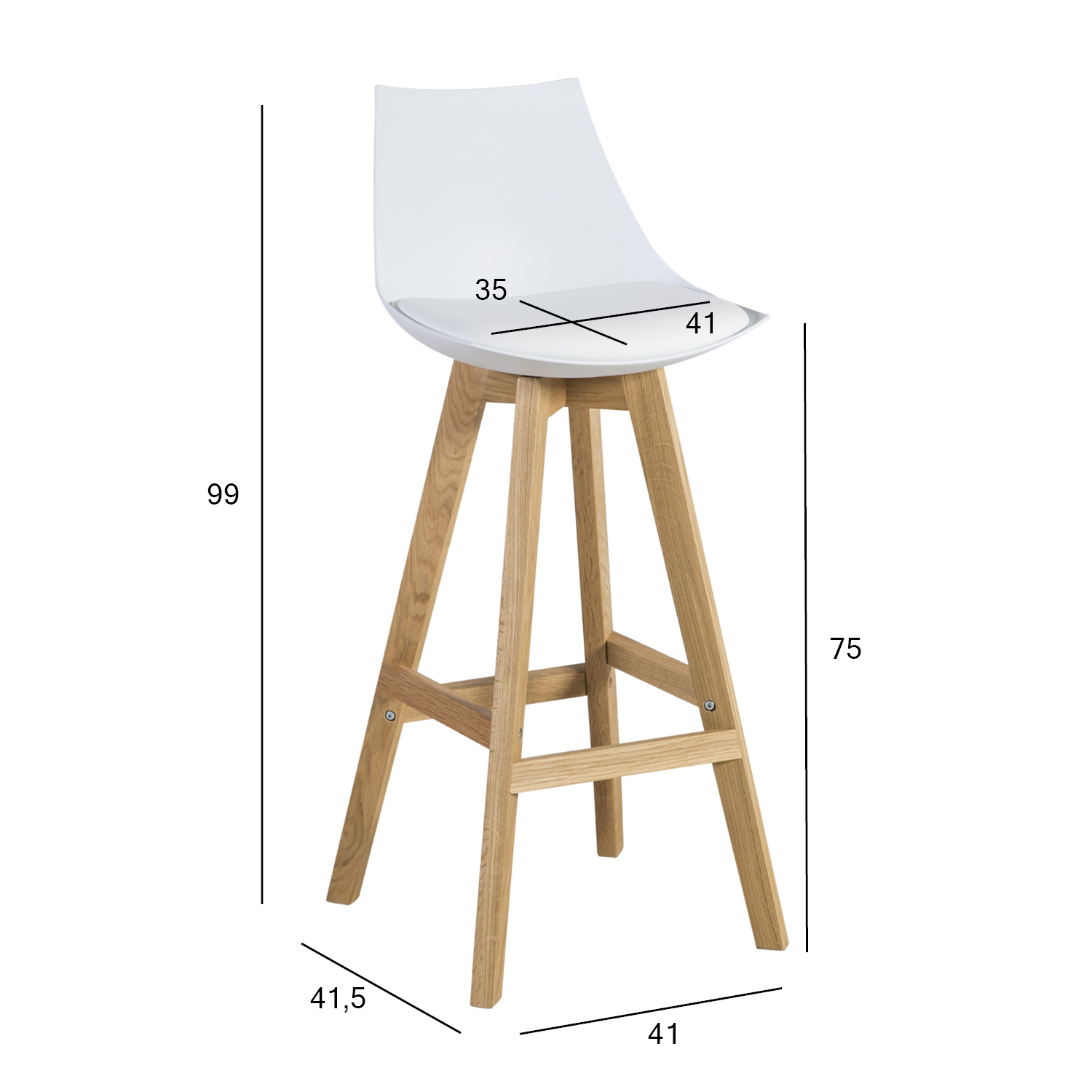 Baro kėdė SONJA, balta. Plastikinės patogios formos sėdynė. Minkštas sėdynės pagrindas aptrauktas oda. Šviesaus ąžuolo kojos. Bendrieji matmenys 41×41,5xH99 cm. Sėdimosios dalies aukštis 75 cm, sėdimosios dalies plotis 41 cm, sėdimosios dalies gylis 35 cm, atlošo aukštis 25,5 cm. Ribinis svoris: 100 kg.