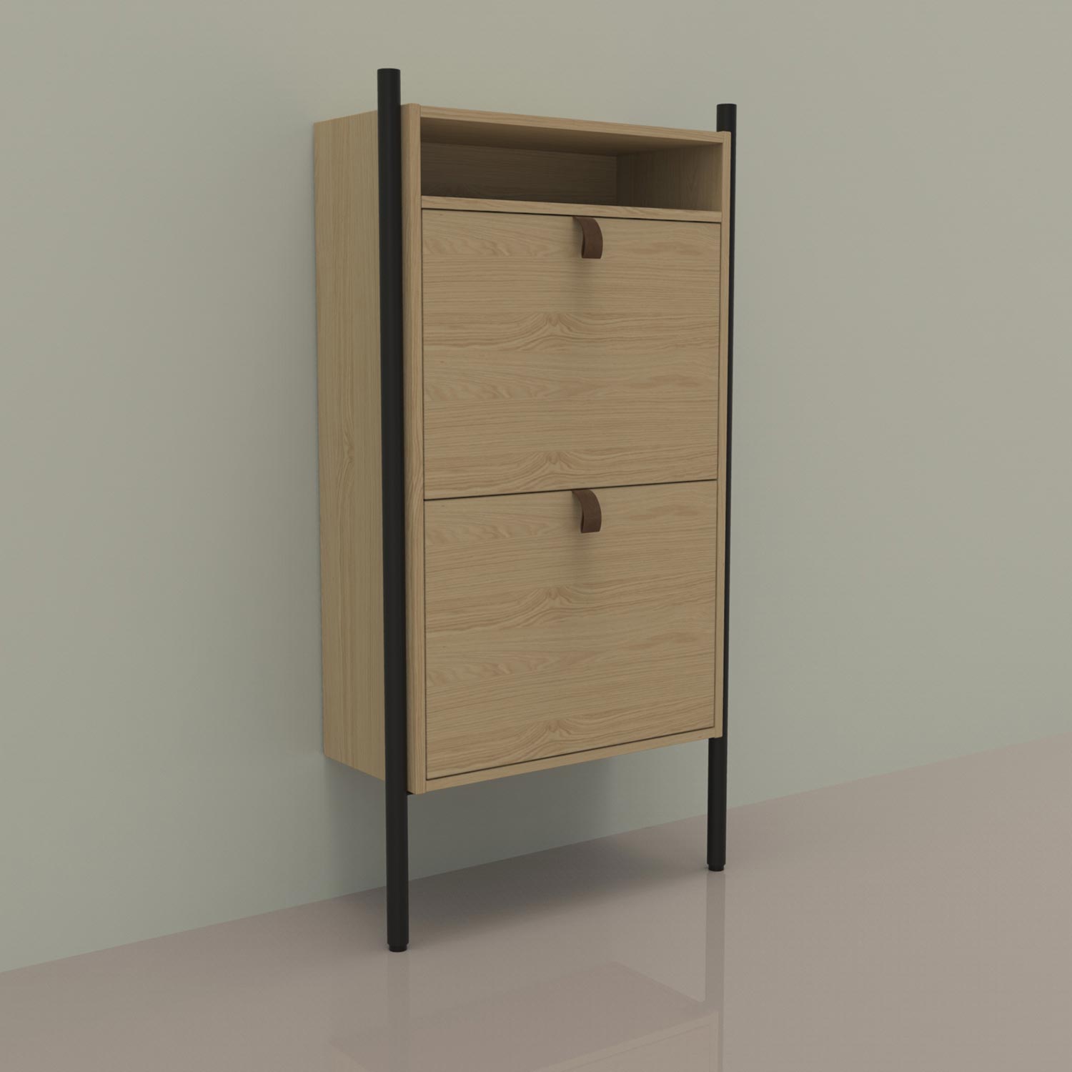 Sieninė batų spinta AALBORG 55,6x26xH91,5 cm, melamino su ąžuolo korpusu. Spintelėje yra du stalčiai batams. Spintelė pagaminta iš melamino. Metalinis rėmas nudažytas juodais milteliniais dažais.