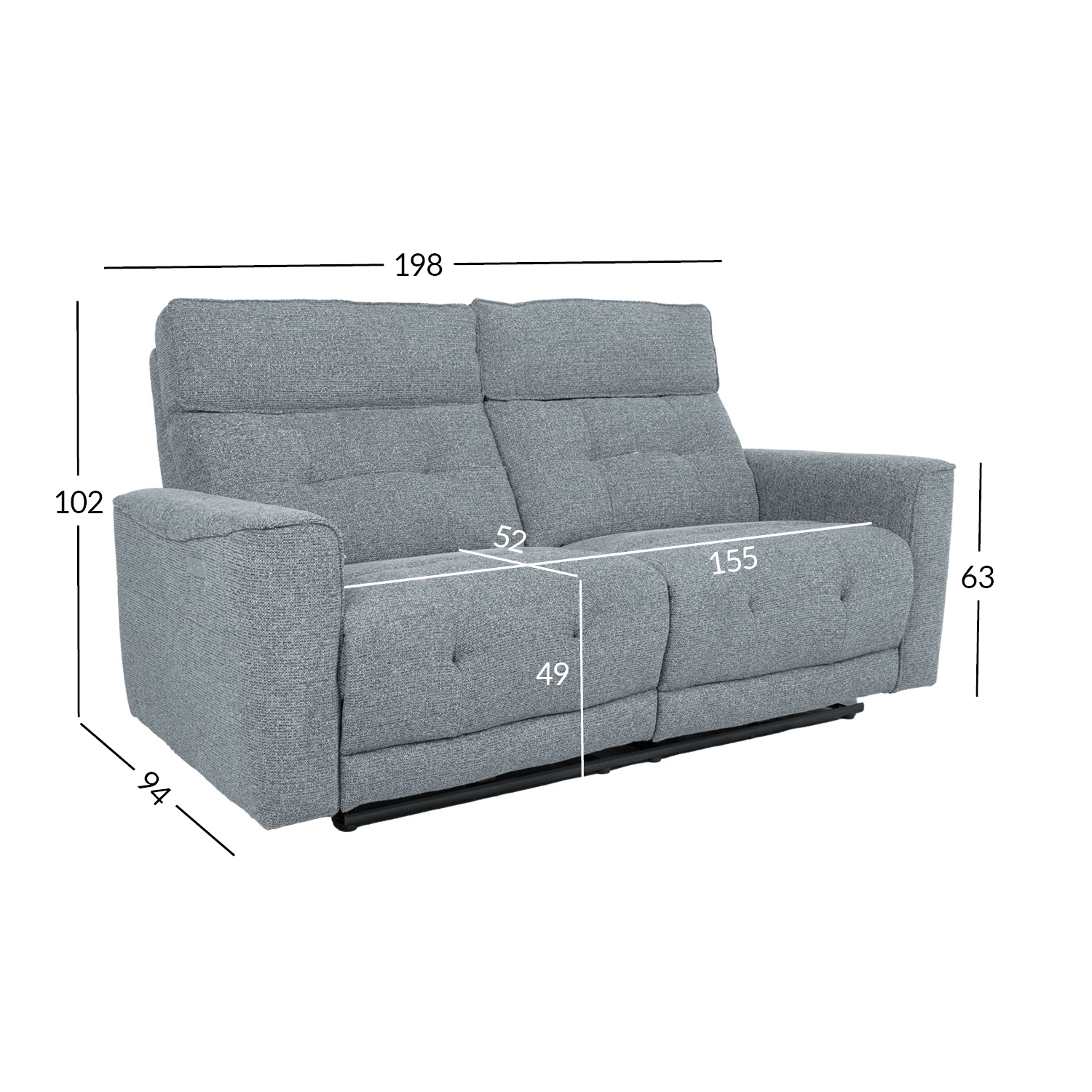 Bendrieji sofos matmenys: 198x94xH102 cm. Sėdimosios dalies plotis 155 cm, sėdimosios dalies gylis 52 cm, sėdimosios dalies aukštis 49 cm. Porankių aukštis nuo žemės 63 cm.