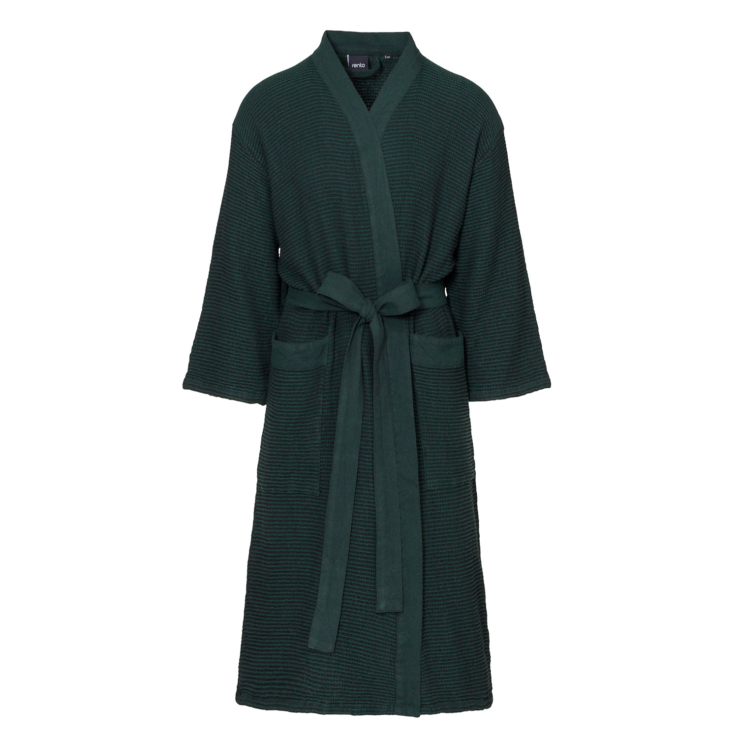 Chalatas RENTO GREEN S/M. Mugua chalatas su chambray kraštais. Pasiūtas iš perdirbtos medvilnės, kuri suteikia audiniui natūralaus minkštumo ir gyvos tekstūros.