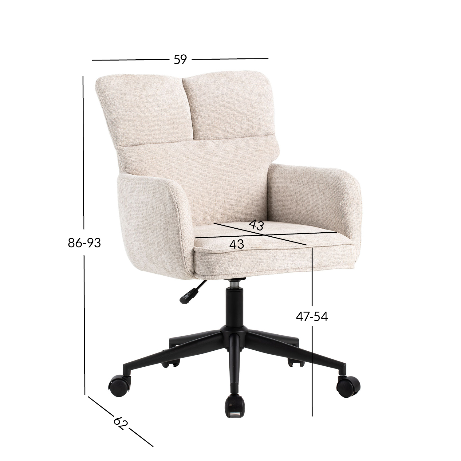 Bendrieji kėdės matmenys yra 59x62xH86-93 cm. Sėdynės plotis 43 cm, sėdynės gylis 43 cm, sėdynės aukštis 47-54 cm.