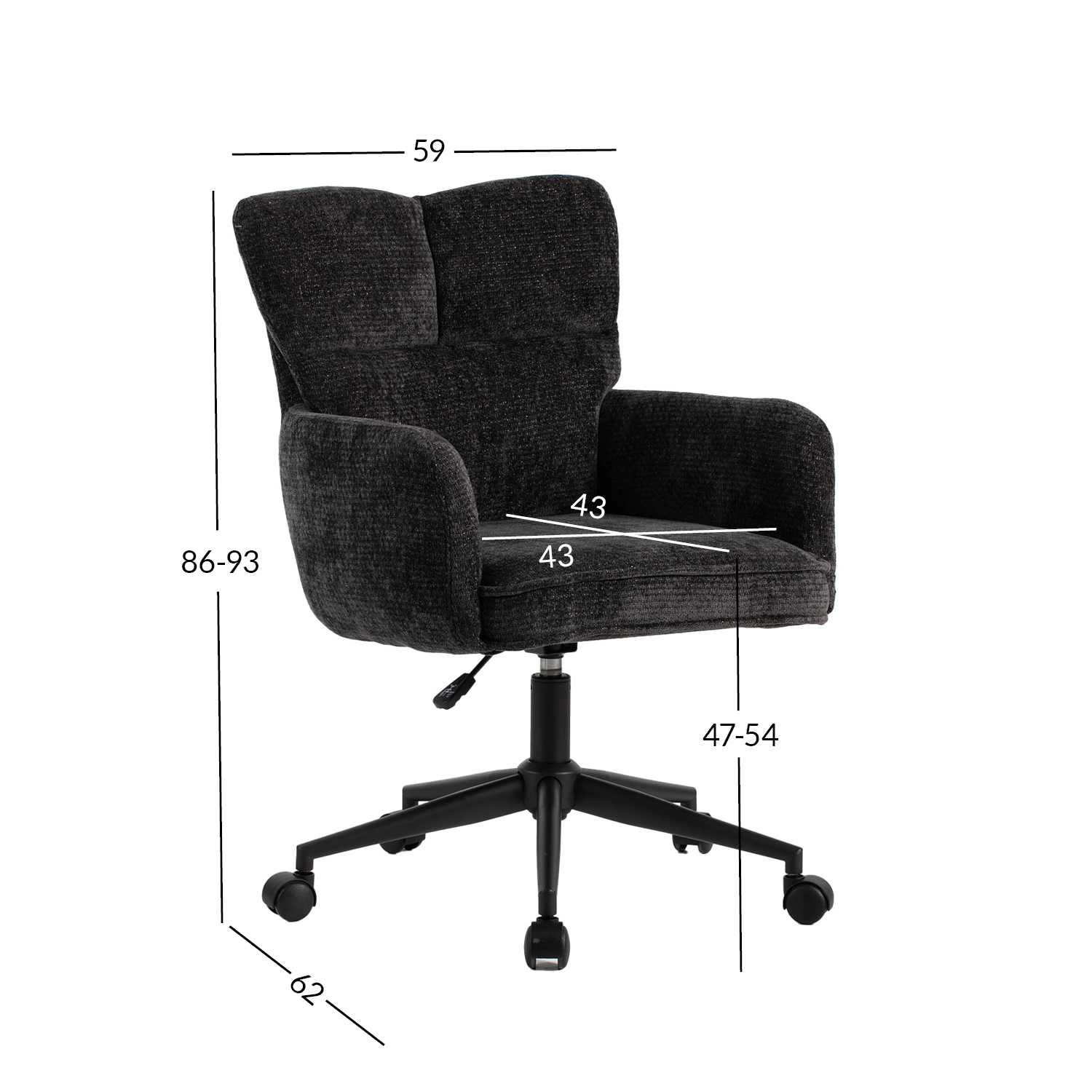 Bendrieji kėdės matmenys yra 59x62xH86-93 cm. Sėdynės plotis 43 cm, sėdynės gylis 43 cm, sėdynės aukštis 47-54 cm.