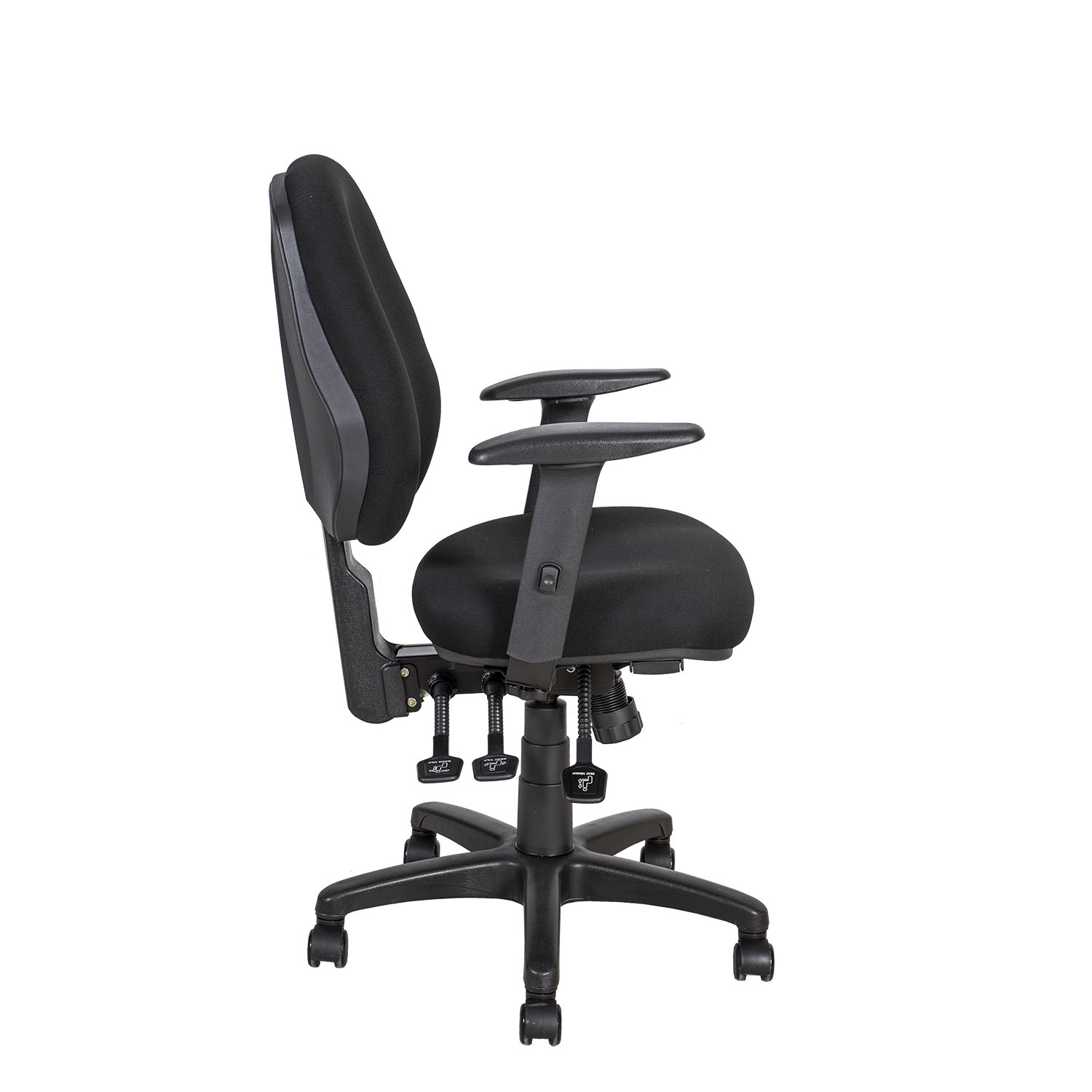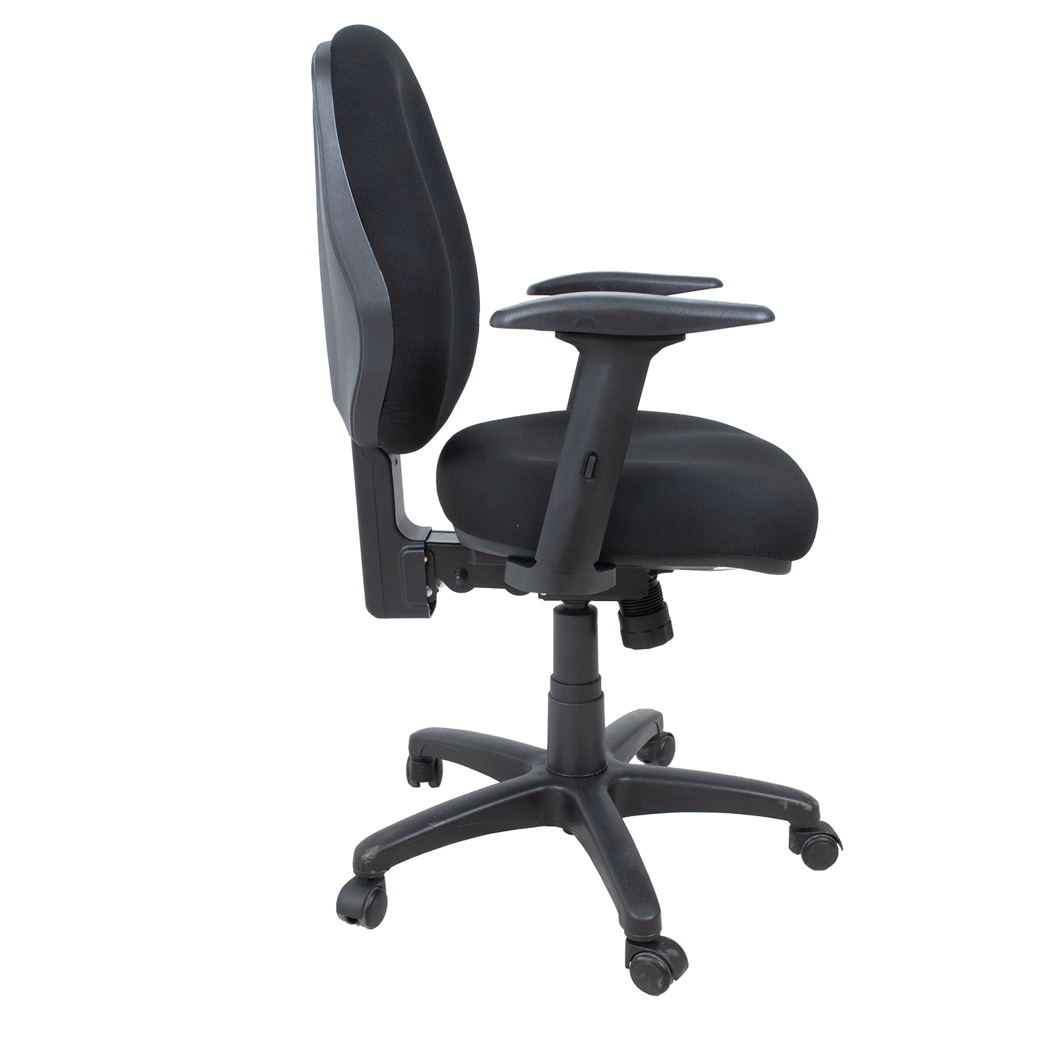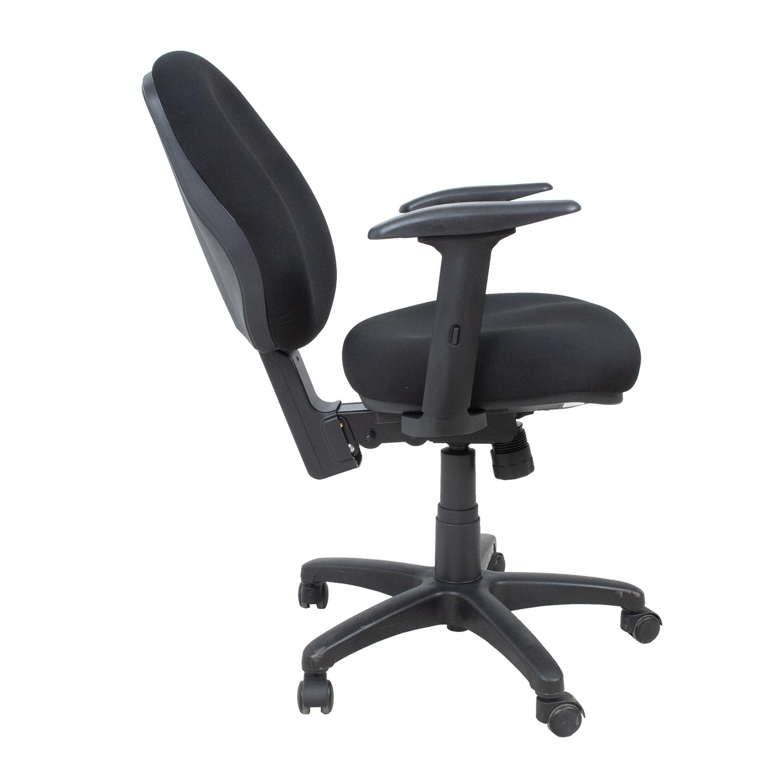 Darbo kėdė SAGA juoda. Ergonomiško dizaino kėdė su universaliu reguliavimu. Sėdynė minkštai apmušta ir patogios formos. Sėdynė aptraukta poliesterio audiniu, 50 000 Martindale. Plastikinis korpusas yra juodos spalvos. Kėdė turi sinchroninį mechanizmą, fiksuojamą keliose padėtyse. Sėdynę ir atlošą galima reguliuoti nepriklausomai. Atlošo aukštis reguliuojamas nuo 49 iki 56,5 cm. Reguliuojamas ir fiksuojamas atlošo kampas. Sėdynės gylis ir sėdimosios dalies kampas reguliuojami, neigiamas pasvirimas. Sėdynės aukštis reguliuojamas droseliais. Plieniniai porankiai padengti juodu plastiku. Porankiai turi patogų poliuretano atraminį paviršių. Porankiai reguliuojami trimis kryptimis. Porankių aukštis reguliuojamas nuo 19,5 iki 29 cm. Porankių atraminį paviršių galima stumdyti pirmyn ir atgal, o pasukimo kampą galima keisti nuo įjungto iki išjungto. Juodos spalvos 5 rankovių atramos kojoms pagamintos iš polipropileno plastiko, D64 cm. Kėdė turi plastikinius ratukus, 50 mm. Bendrieji kėdės matmenys yra 64x64x95,5-115 cm. Kėdės aukštis 95,5-115 cm, sėdynės aukštis 46,5-49 cm, sėdynės gylis 39-44 cm, sėdynės plotis 44 cm. Ribinis svoris 120 kg.