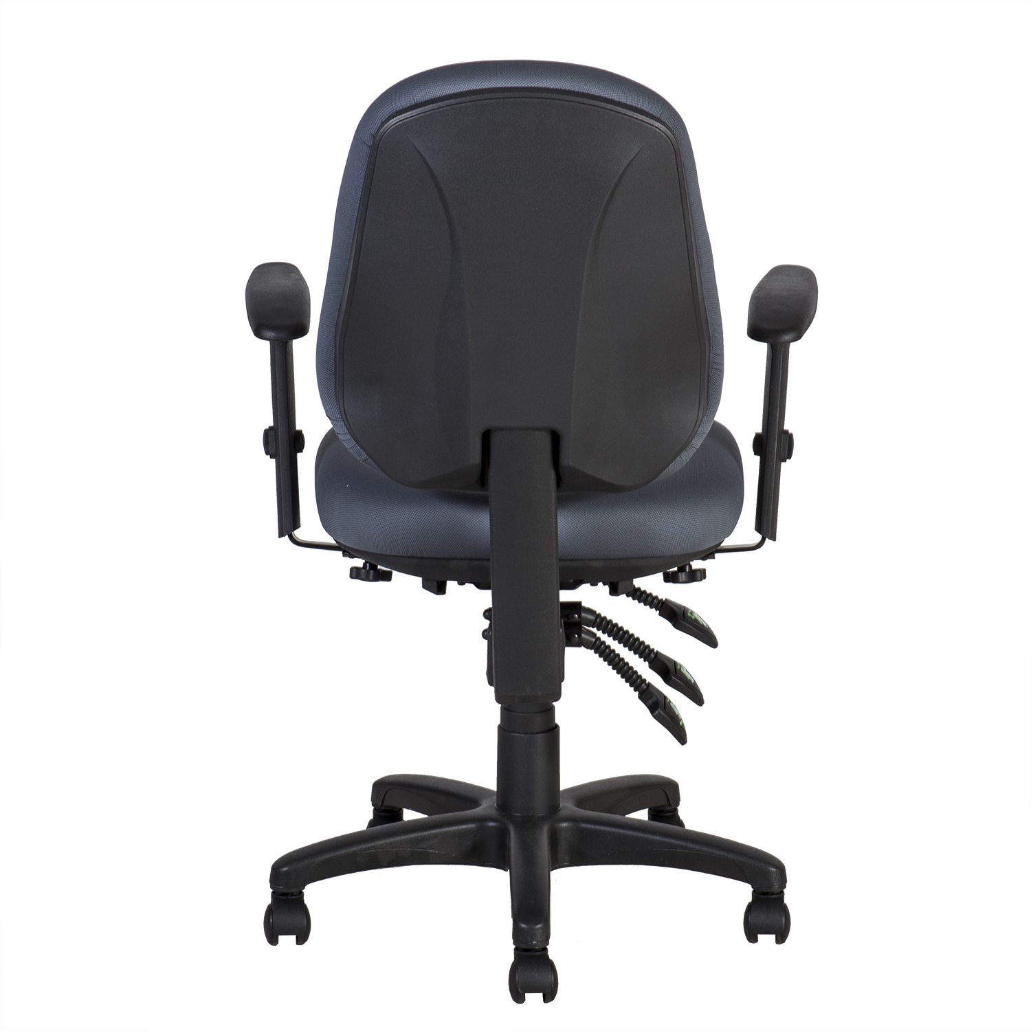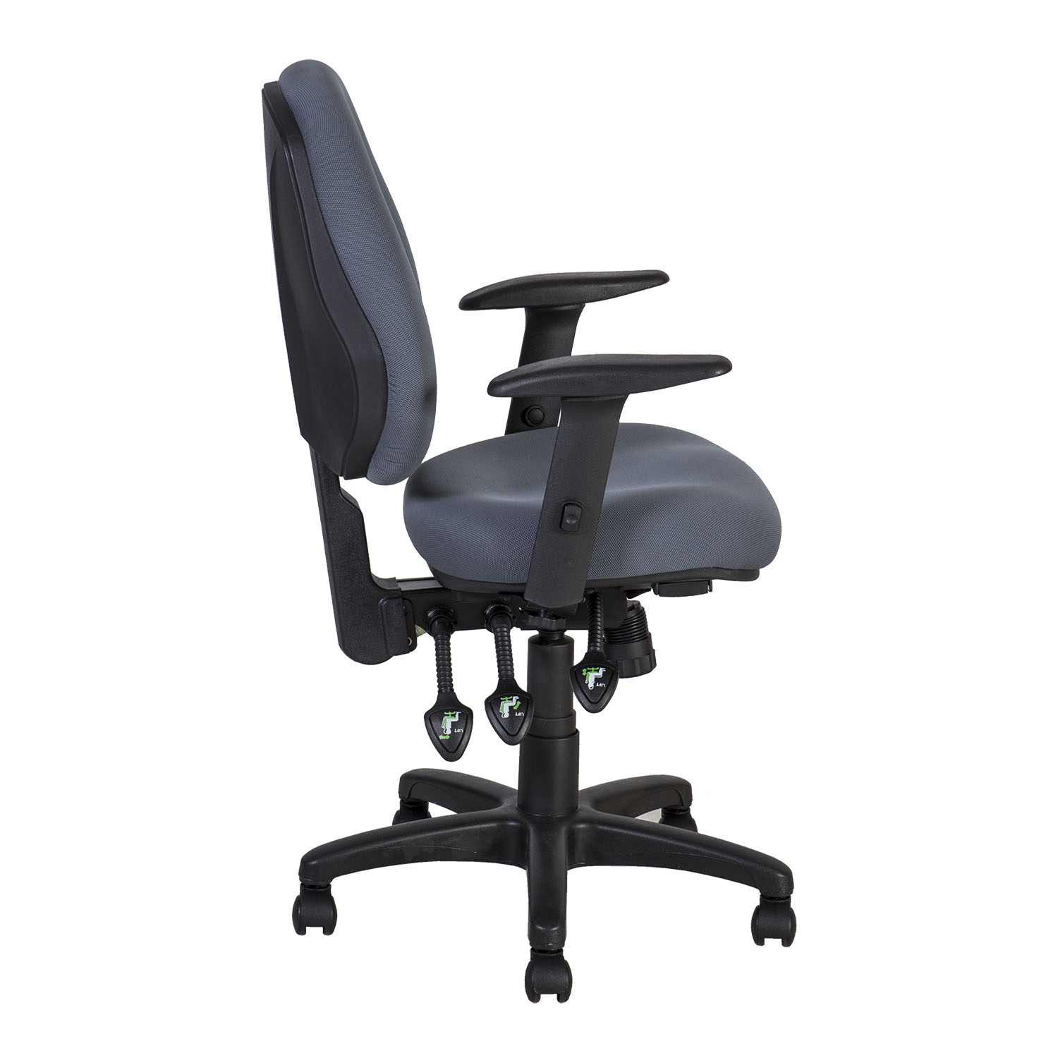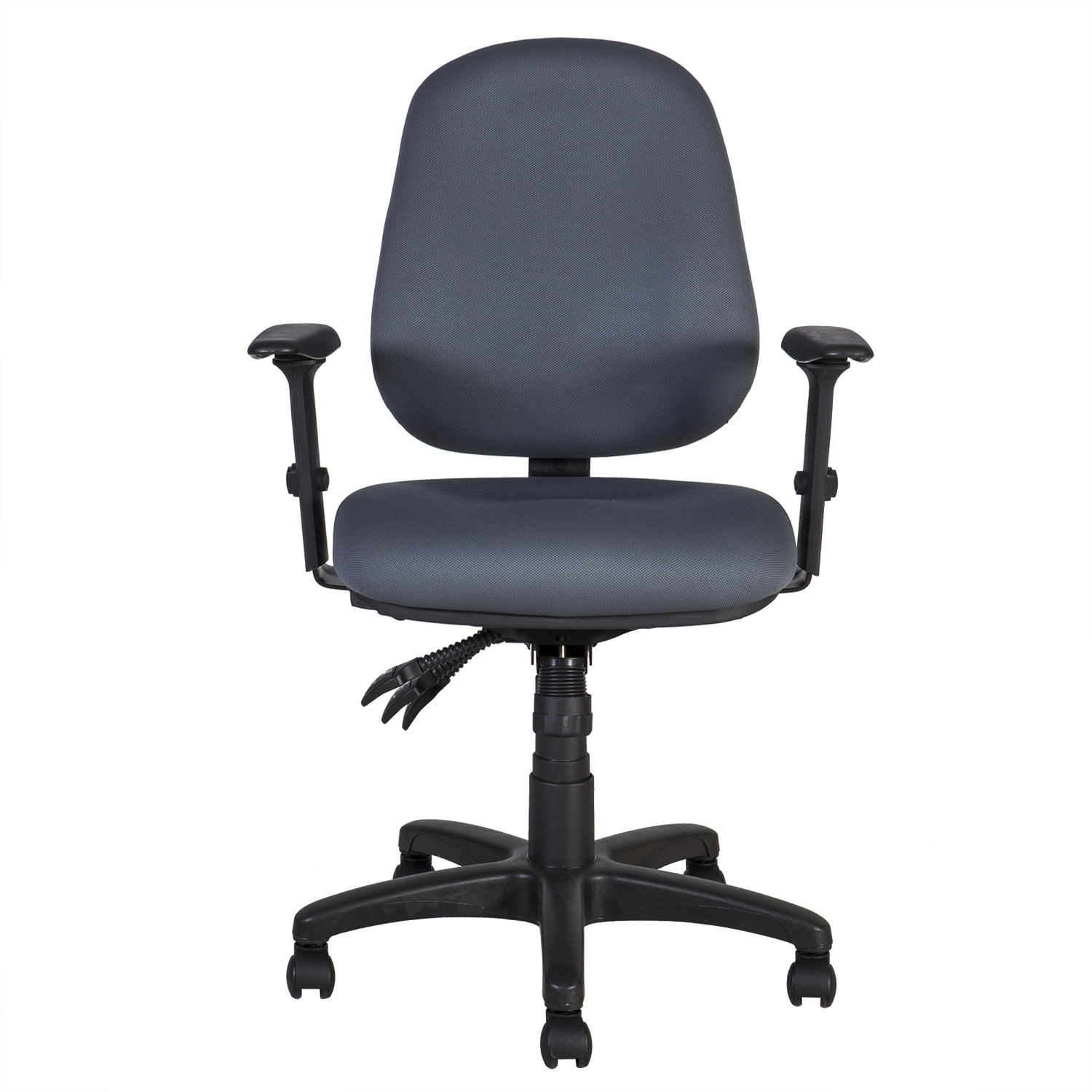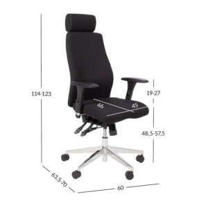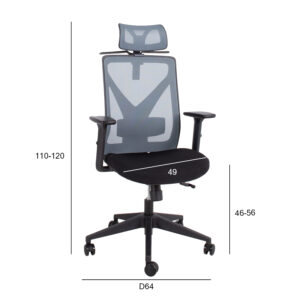 Darbo kėdė SAGA pilka. Ergonomiška suprojektuota darbo kėdė su universaliu reguliavimu. Sėdynė minkštai apmušta ir patogios formos. Sėdynė aptraukta poliesterio audiniu, 50 000 Martindale. Plastikinis kėdės korpusas yra juodos spalvos. Kėdė turi sinchroninį mechanizmą, fiksuojamą keliose padėtyse. Sėdynę ir atlošą galima reguliuoti nepriklausomai. Atlošo aukštis reguliuojamas nuo 49 iki 56,5 cm. Atlošo kampas reguliuojamas ir fiksuojamas. Sėdynės gylis ir sėdimosios dalies kampas reguliuojamas, neigiamas pasvirimas. Sėdynės aukštis reguliuojamas dujiniu dangteliu. Plieniniai porankiai padengti juodu plastiku. Porankiai turi patogų poliuretano atraminį paviršių. Porankiai reguliuojami trimis kryptimis. Porankių aukštis reguliuojamas nuo 19,5 iki 29 cm. Porankių atraminį paviršių galima stumdyti pirmyn ir atgal, o pasukimo kampą galima keisti nuo įjungto iki išjungto. Juodos spalvos 5 rankovių atramos kojoms pagamintos iš polipropileno plastiko, D64 cm. Kėdė turi plastikinius ratukus, 50 mm. Kėdės aukštis 95,5-115 cm, sėdynės aukštis 46,5-49 cm, sėdynės gylis 39-44 cm, sėdynės plotis 44 cm Gaminio matmenys 64x64xH95,5-115 cm. Kėdės svorio riba 120 kg.