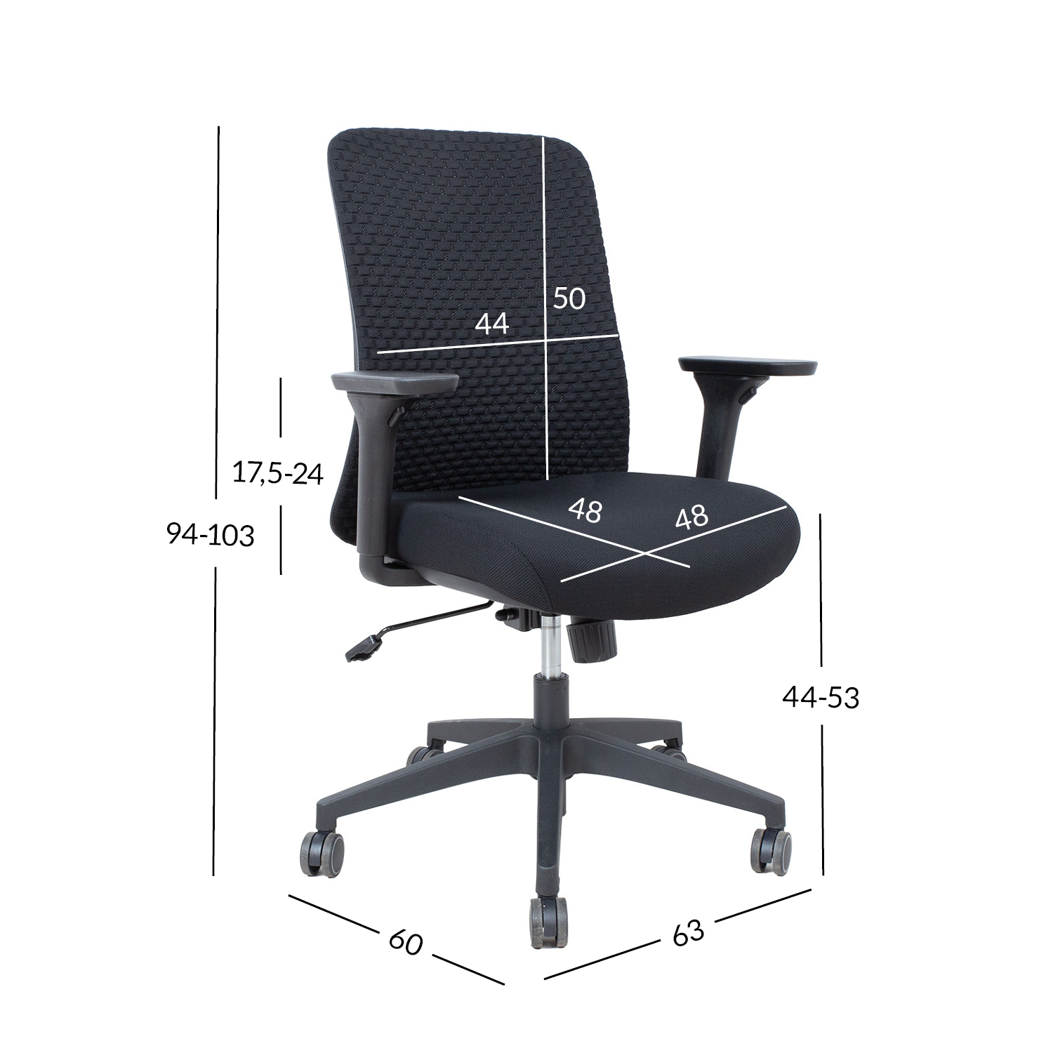 Sėdynės plotis 48 cm, sėdynės gylis 48 cm, sėdynės aukštis 44-53 cm.