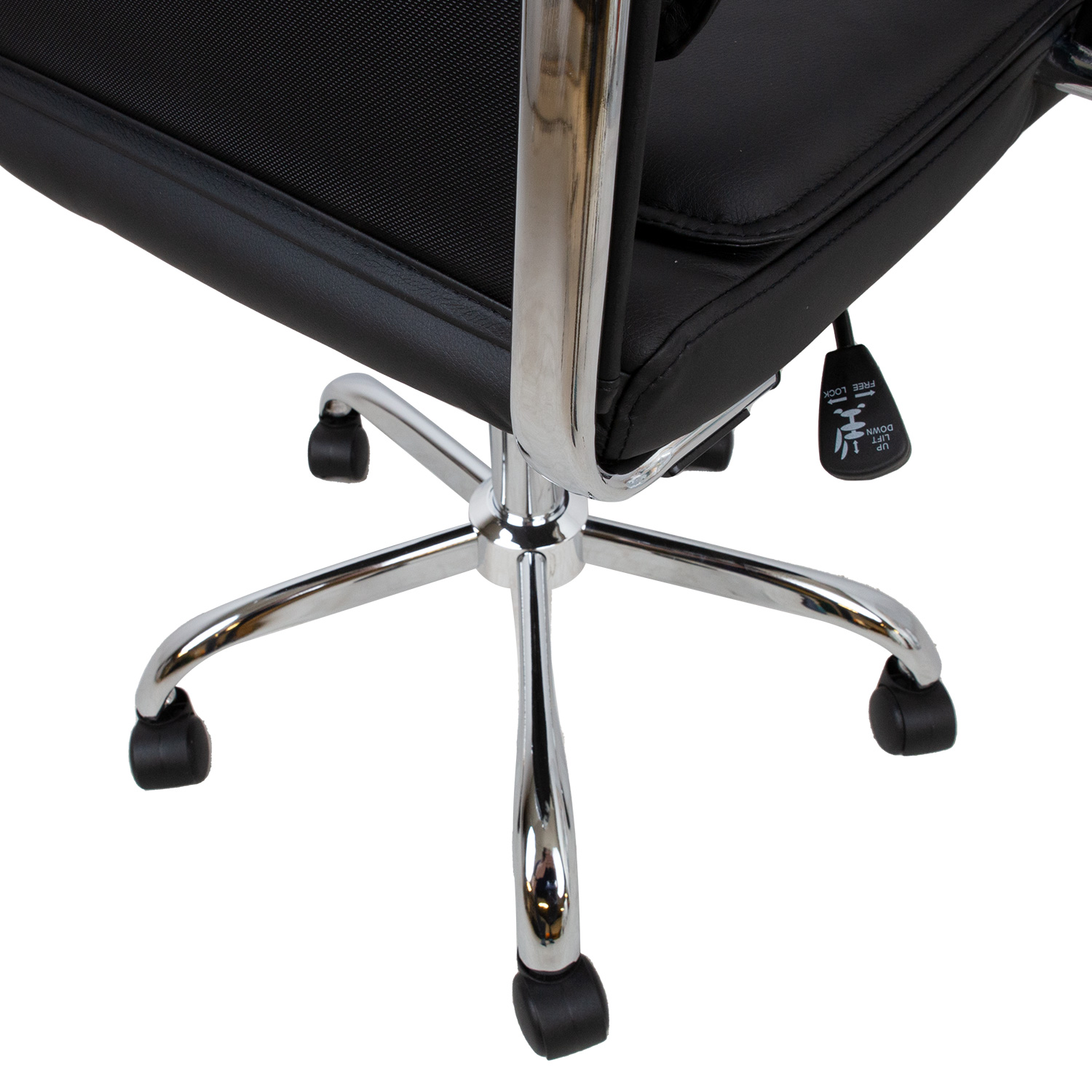 Darbo kėdė ULTRA, juoda oda. Sėdynė ir atlošas aptraukti juoda oda. Kėdė turi supamąjį mechanizmą. Sėdynės aukštis reguliuojamas dujine virvele. Chromuotos metalinės rankenos padengtos oda. Kėdė turi 5 rangų chromuotą R30 cm ilgio kojų atramą ir plastikinius D50 mm ratukus. Bendrieji kėdės matmenys yra 54,5x63xH94-104 cm, sėdynės plotis 47 cm, sėdynės gylis 51 cm. Atlošo plotis 45,5 cm, atlošo aukštis 55 cm. Ribinis svoris 100 kg.