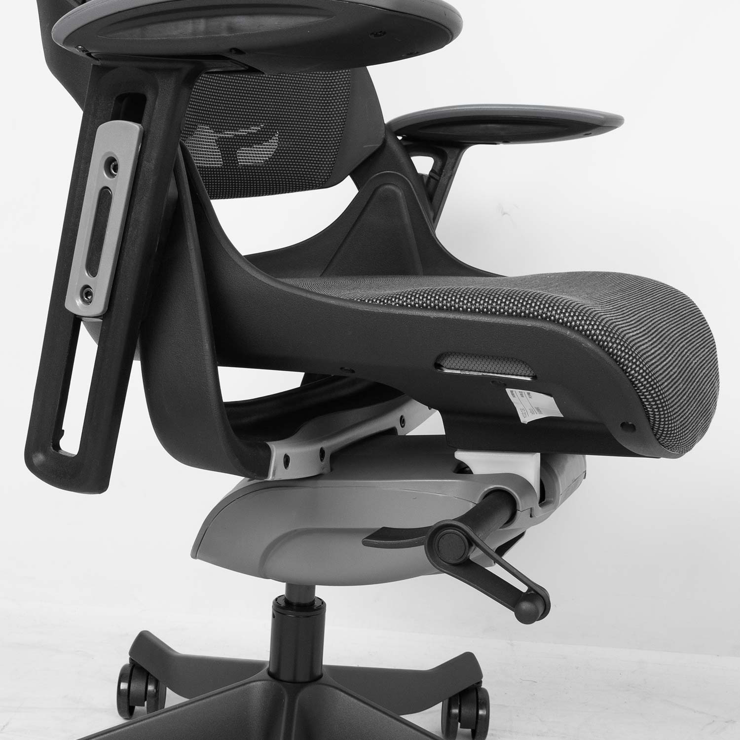 Kėdės sėdynė ir atlošas aptraukti pilku tinkliniu audiniu (76 % polielastomero, 24 % poliesterio), Martindale vertė 100 000.
