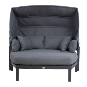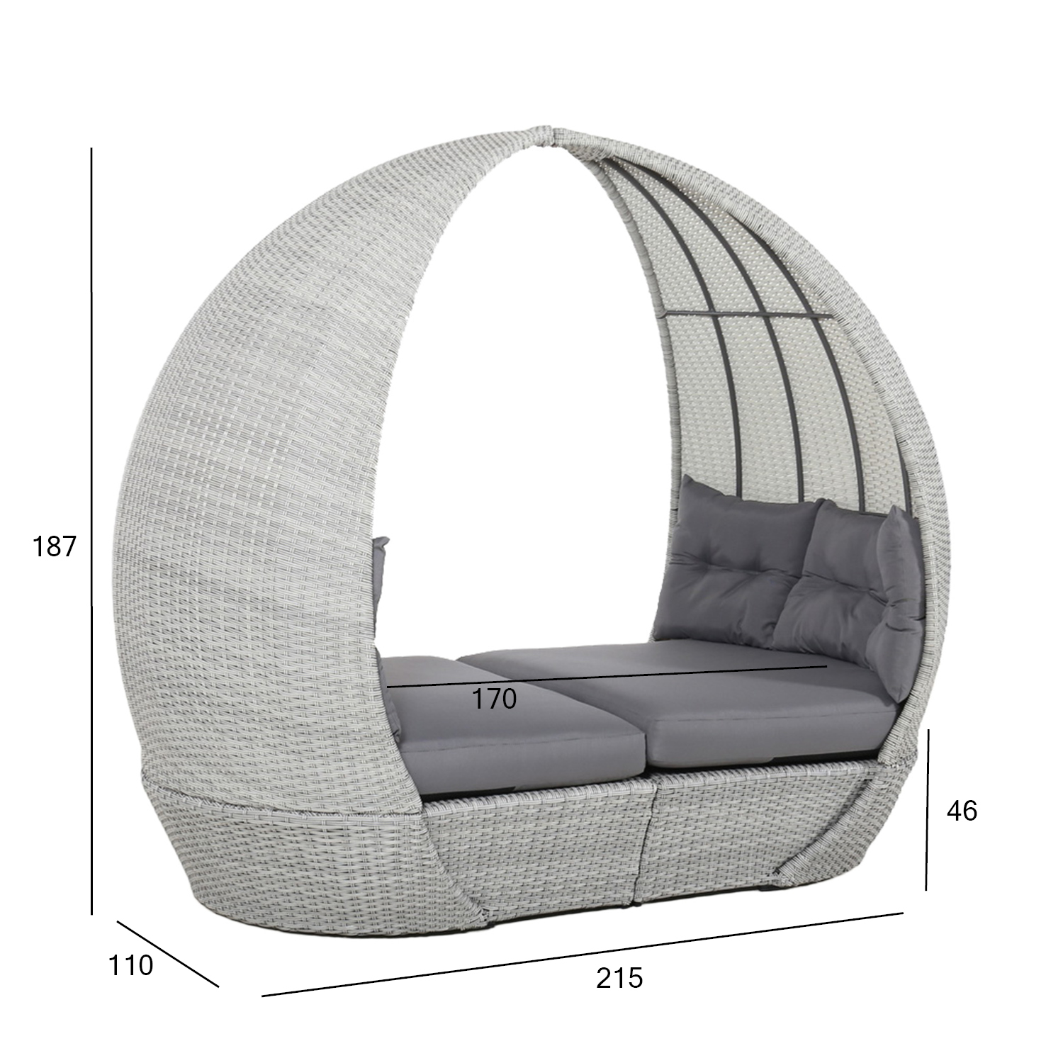 Lebola ASCOT 215x110xH187cm, pilkos spalvos. Lebola aliumininis rėmas, padengtas pilku plastikiniu pynimu. Sėdynės matmenys 136/200×110 cm, sėdynės aukštis su pagalvėle 46 cm. Lenkta sėdynės pagalvėlė sudaryta iš dviejų pusių. Sėdynės pagalvėlės matmenys 68/100x110xH13cm – 2 vnt. Atlošo pagalvėlės matmenys 118x50x8cm – 2vnt. Pagalvėlės pagamintos iš pilko olefino audinio. Gaminys yra atsparus besikeičiančioms oro sąlygoms ir labai lengvai prižiūrimas, tik pagalvėles reikia apsaugoti nuo atmosferos poveikio. PRIEŽIŪRA: pasibaigus vasaros sezonui, rekomenduojame sodo baldus laikyti patalpoje. Jeigu sezonui, sodo baldus reikėtų laikyti sode. Sandėliavimui naudokite vėsią, sausą ir gerai vėdinamą patalpą.