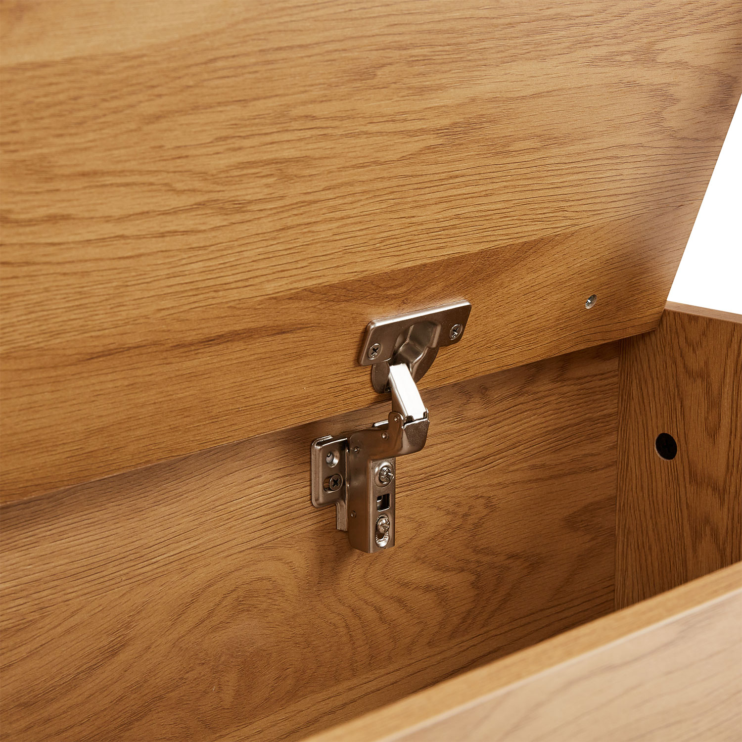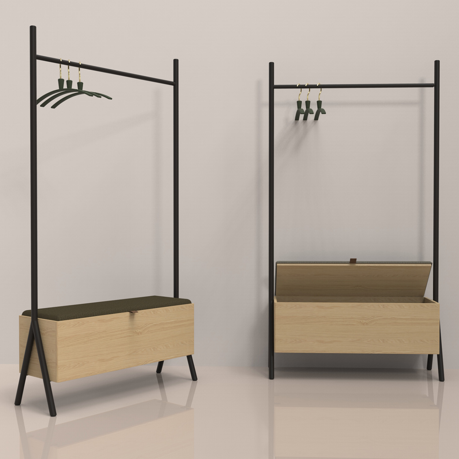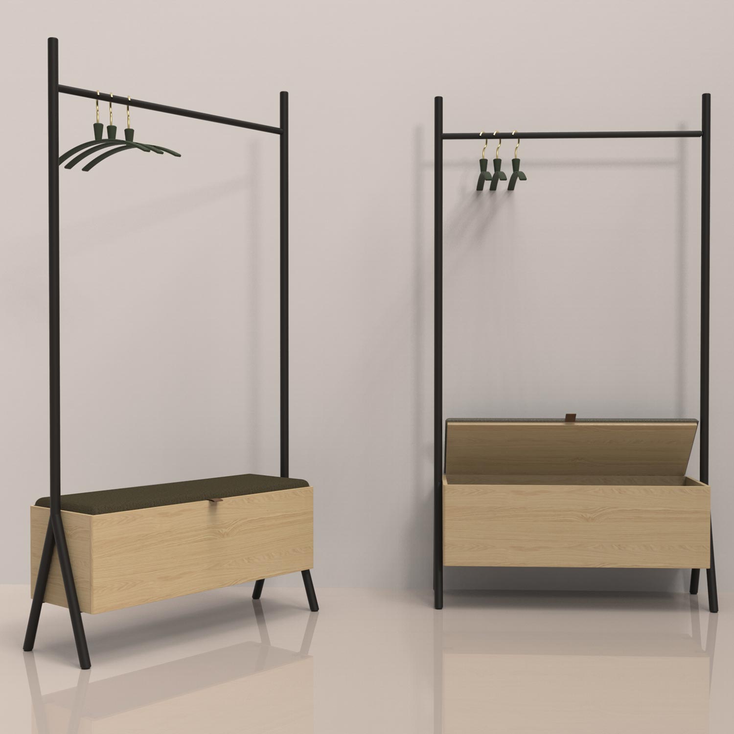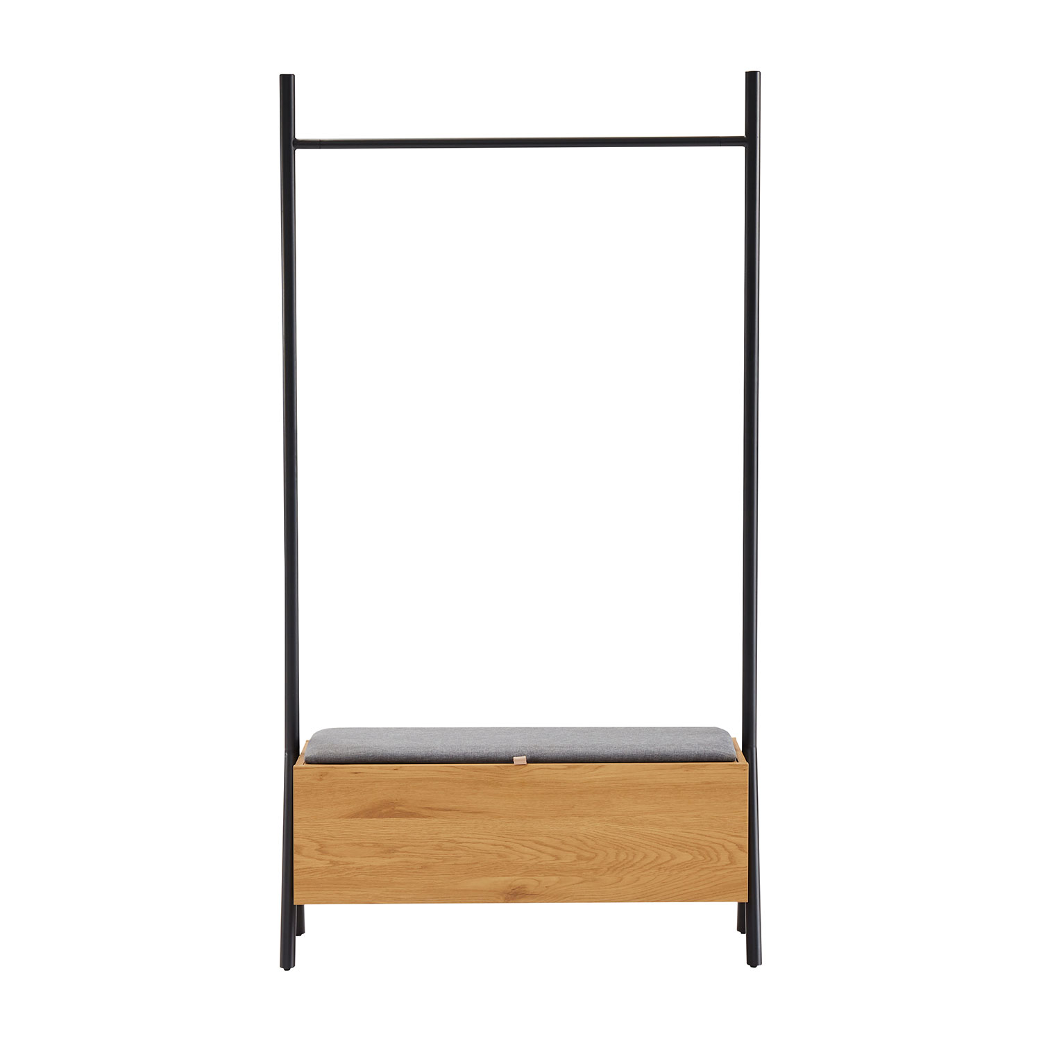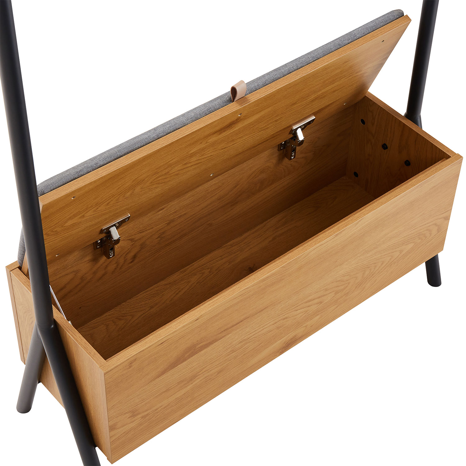 Prieškambaris AALBORG su suolu 97x32xH180cm, melaminas su ąžuolo stalviršiu. Suoliuko rėmas pagamintas iš metalo ir nudažytas juodais milteliniais dažais. Suoliukas pagamintas iš melamino. Suolo viduje yra didelė daiktadėžė. Sėdimoji dalis lengvai apmušta ir aptraukta poliesterio audiniu.