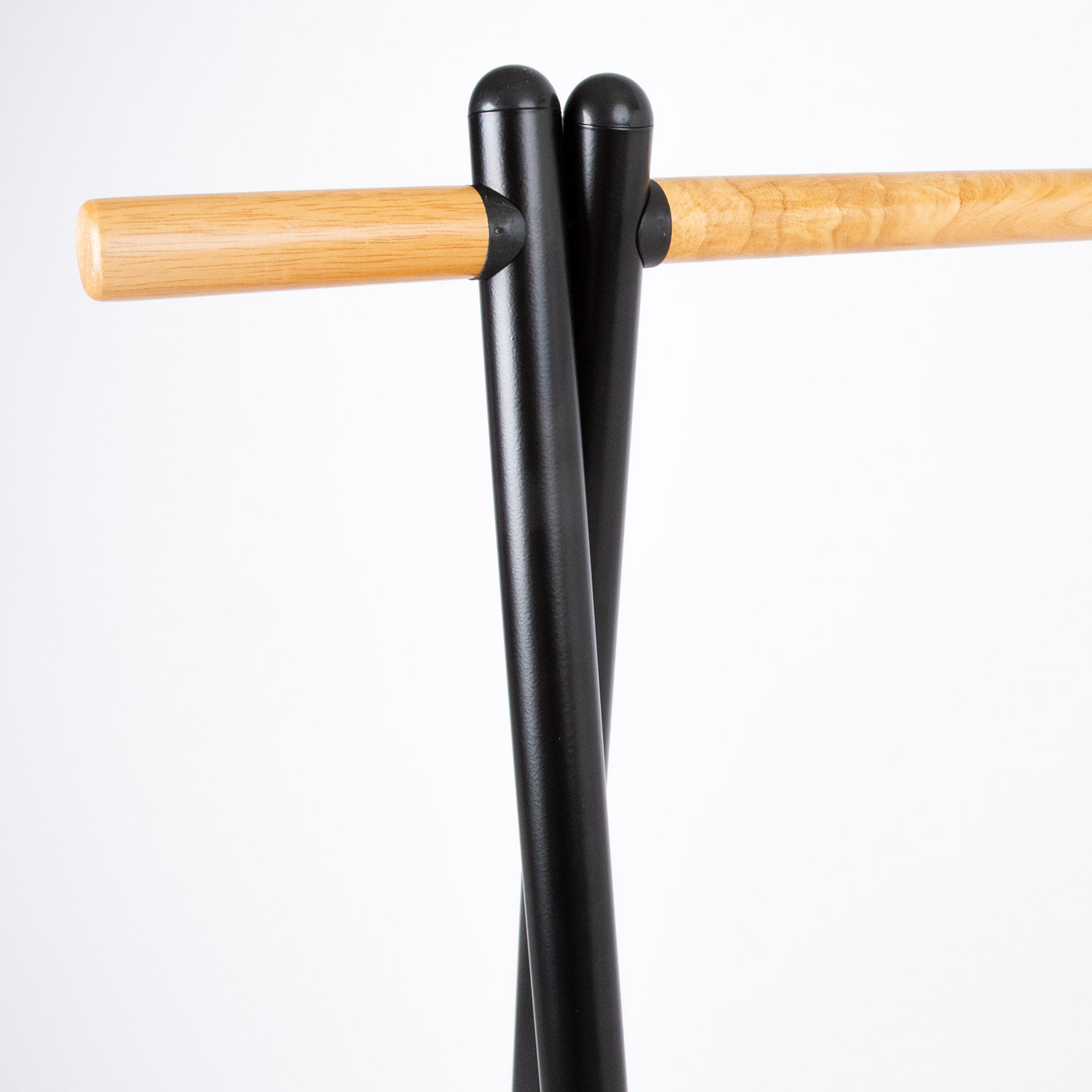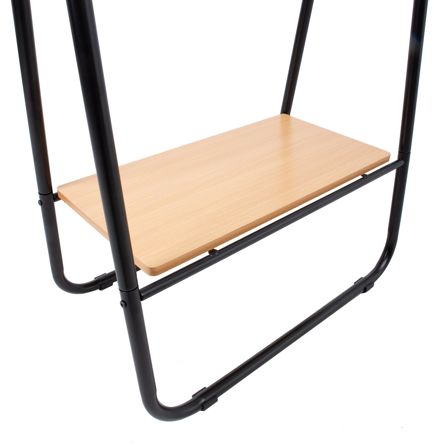 Lazdelė GLADE šviesiai rudos spalvos. Šis elegantiškas ir praktiškas stovas idealiai tinka drabužiams laikyti. Viršutinėje lentynos dalyje yra medinis pakabinamas strypas. Apačioje esanti lentyna pagaminta iš natūralios spalvos laminato. Stelažo plieninis rėmas dažytas milteliniu būdu juoda spalva. Stelažo matmenys 90x41xH156 cm.