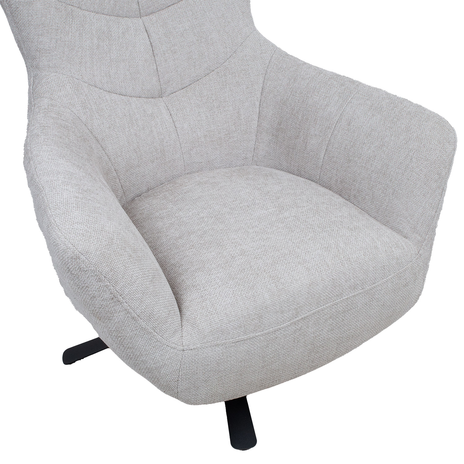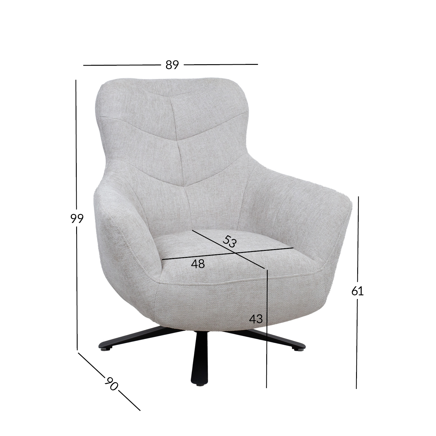 Fotelis HELGA šviesiai pilkos spalvos. Šis elegantiškas, švelnių linijų fotelis kviečia ir greitai užkariauja širdis dėl savo ypatingo patogumo. Gerai apgalvotas dizainas ir kruopščiai parinktos kokybiškos medžiagos užtikrina nesenstantį ir ilgaamžį rezultatą, kuris puikiai tinka prie įvairių stilių ir kambarių dizaino. Kėdė sukasi 360° kampu, todėl galima patogiai prieiti prie jos ir apžvelgti viską aplinkui nesikilnojant. Kėdės rėmas pagamintas iš metalo. Sėdynės viduje yra spyruoklinis blokas. Apmušalas pagamintas iš aukštos kokybės poliuretano putų, kurių tankis 18/24/26 kg/m³. Fotelis aptrauktas minkštu poliesterio audiniu. Tvirtas plieninis 4 rangų kojų atraminis porankis padengtas juoda milteline danga. Kėdės gabaritiniai matmenys yra 89x90xH99 cm. Sėdimosios dalies plotis 48 cm, sėdimosios dalies gylis 53 cm, sėdimosios dalies aukštis 43 cm. Porankio aukštis nuo žemės 61 cm. Ribinis svoris 200 kg.