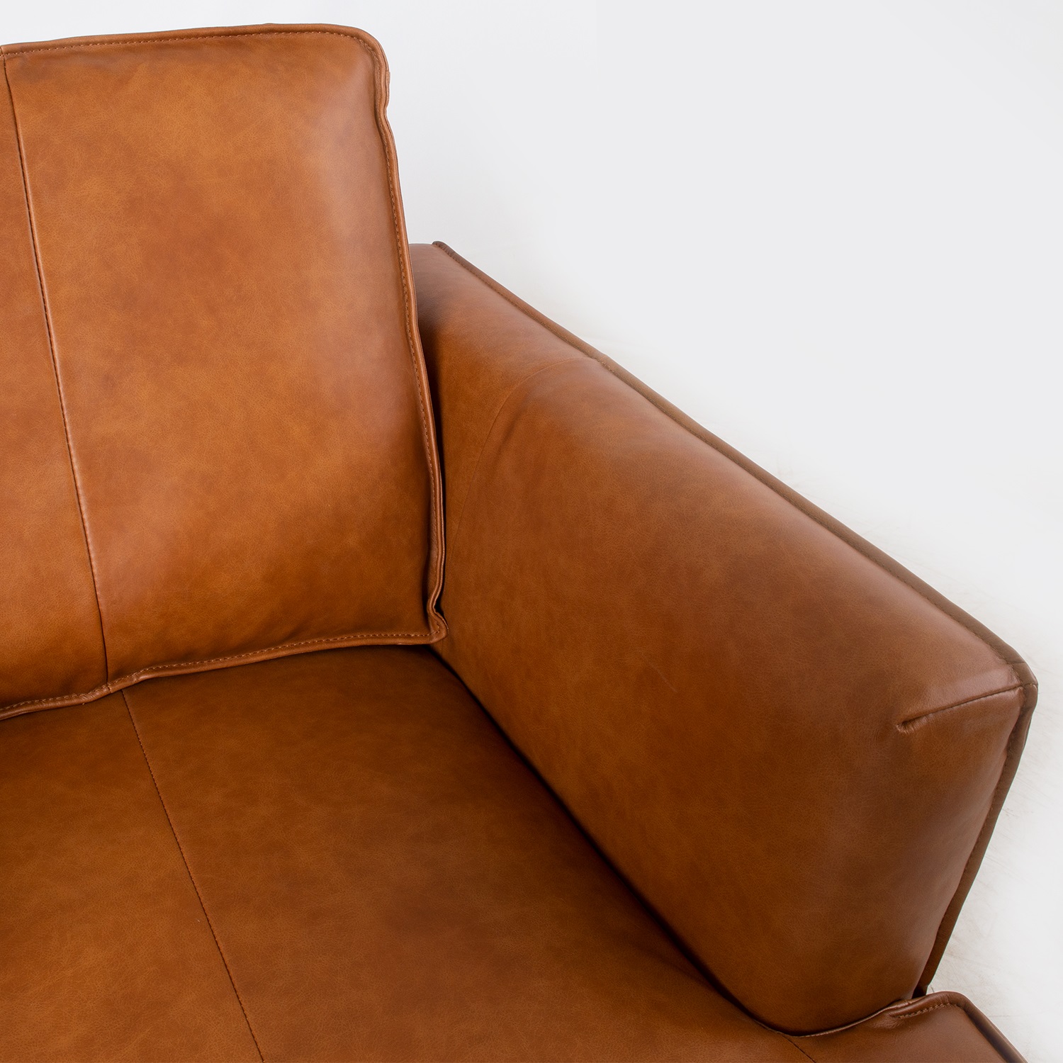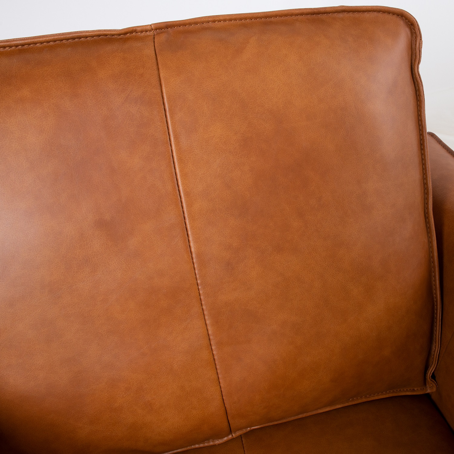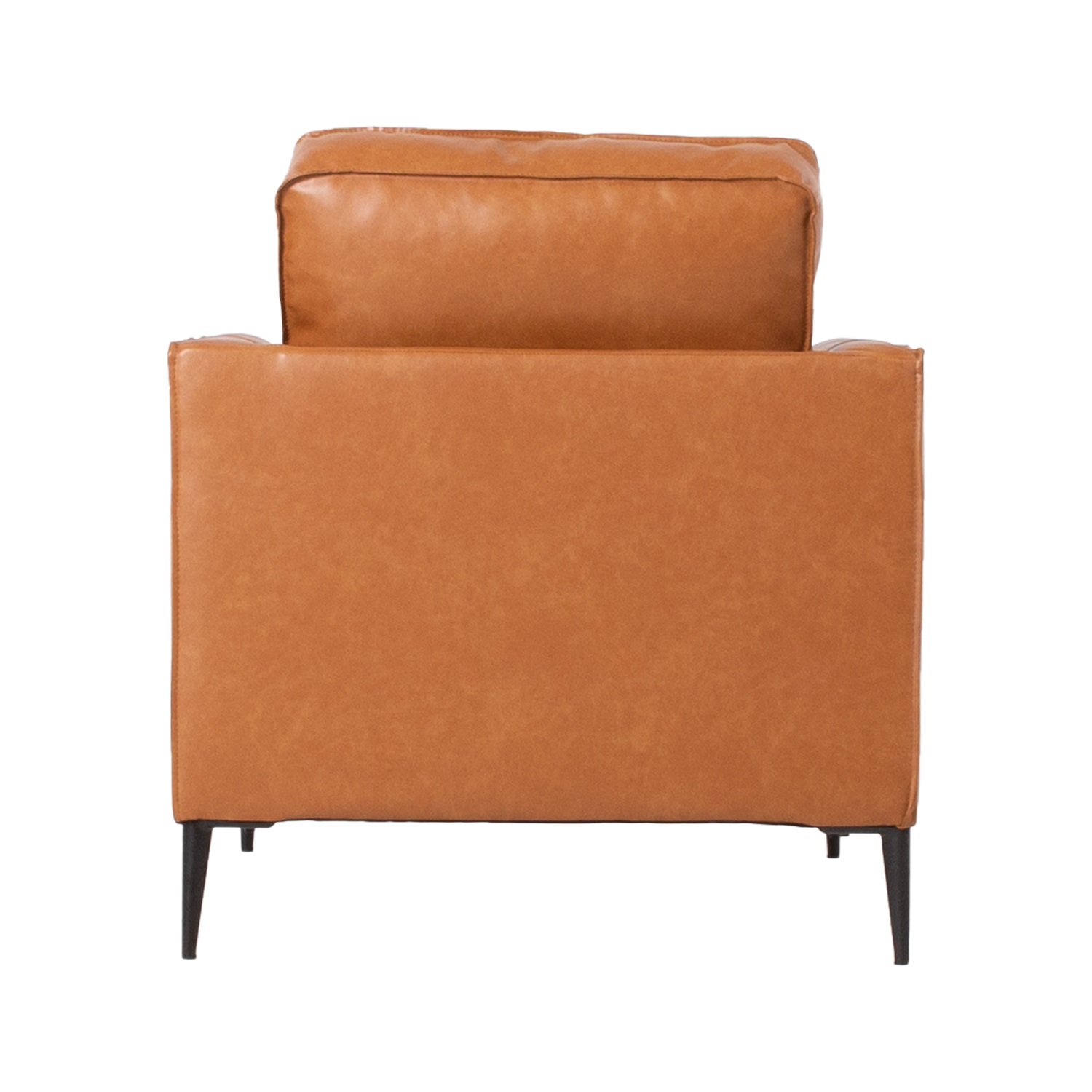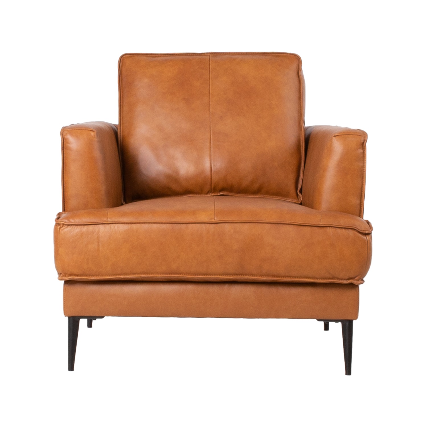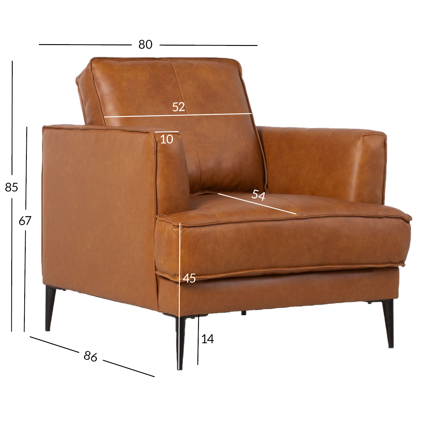 Fotelis LEO šviesiai rudos spalvos. Užvalkalas pagamintas iš natūralios karvės odos ir dirbtinės odos. Rėmas pagamintas iš eukalipto medienos ir faneros. Gaminys turi kišenines spyruokles. Apmušalas: putų poliuretanas. Fotelio kojos pagamintos iš metalo. Gaminio matmenys: 80x86xH85 cm.