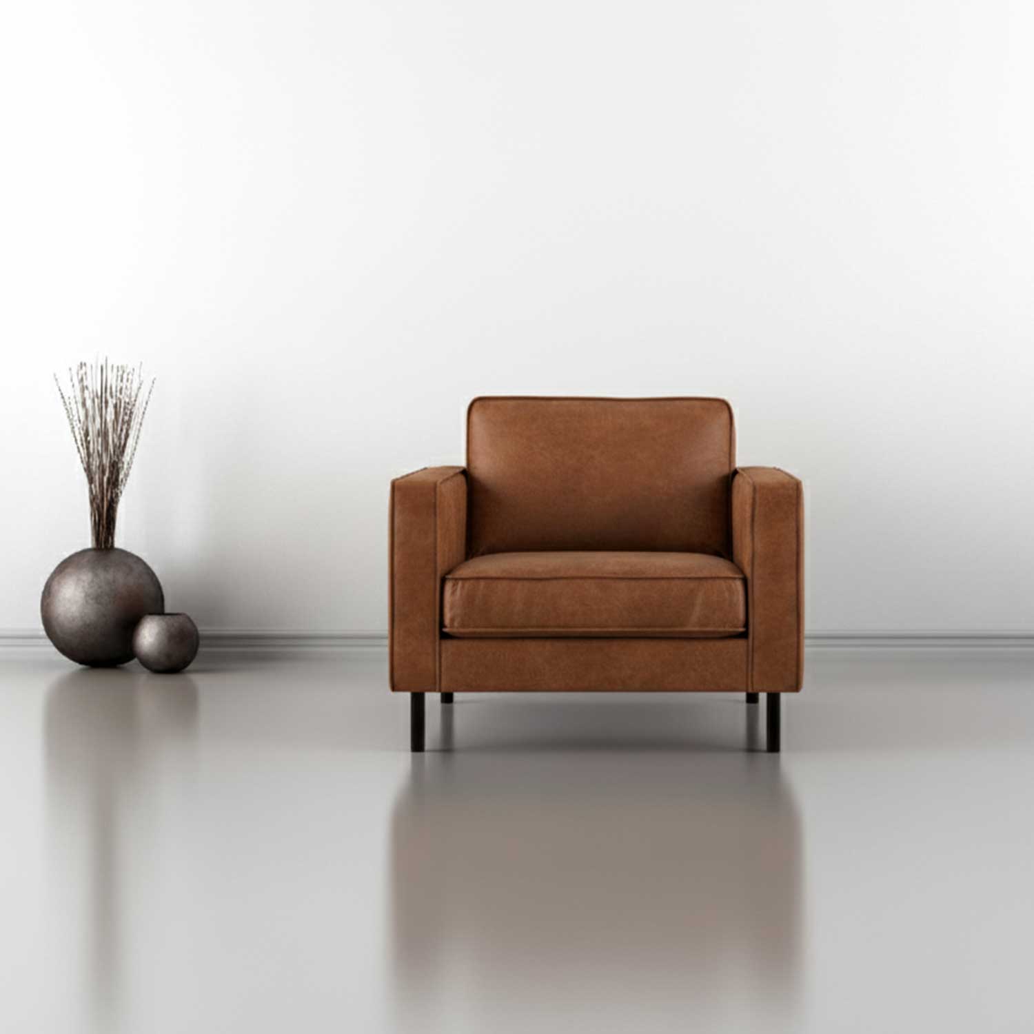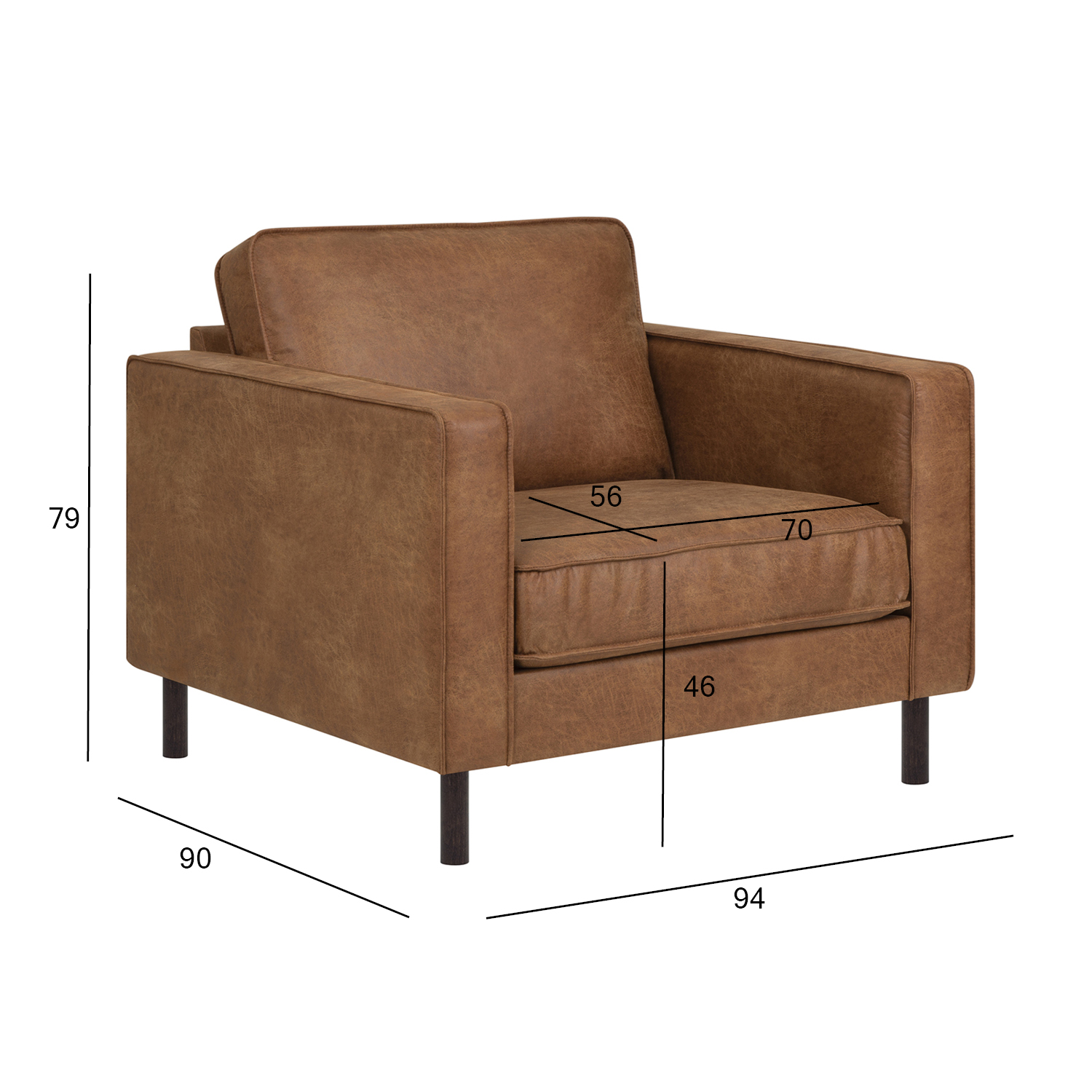 Fotelis LUCAS rudas. Fotelis aptrauktas oda. Sėdynės pagalvėlė pagaminta iš porolono. Atlošo pagalvėlė užpildyta poliesterio pluoštu ir porolonu. Užpildas yra atskirame užvalkale. Sėdynės ir atlošo pagalvėlės užvalkalas nuimamas. Karkasas pagamintas iš medžio masyvo, faneros, medienos plaušų plokštės ir medžio drožlių plokštės. Rėmas padengtas 6 mm 20 kg/m3 porolono danga. Gaminys turi zigzaginę pakabą. Jis turi keturias medžio masyvo kojas. Kojų spalva – moka. Kojų aukštis – 14 cm. Sėdynės aukštis 45 cm, sėdynės plotis 70 cm, sėdynės gylis 54 cm. Gaminio matmenys: 95x87xH81 cm. Gaminys pagamintas ES.