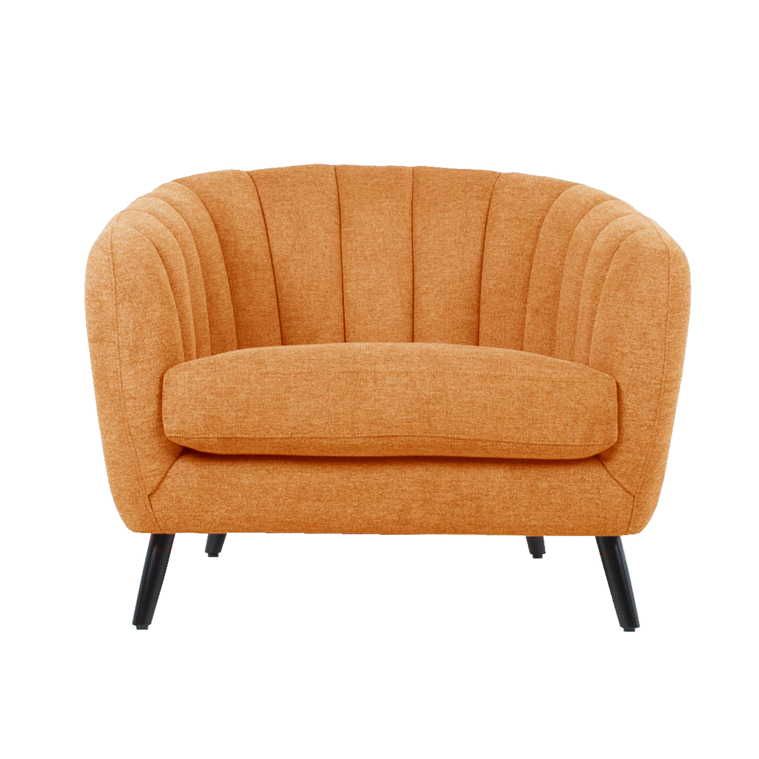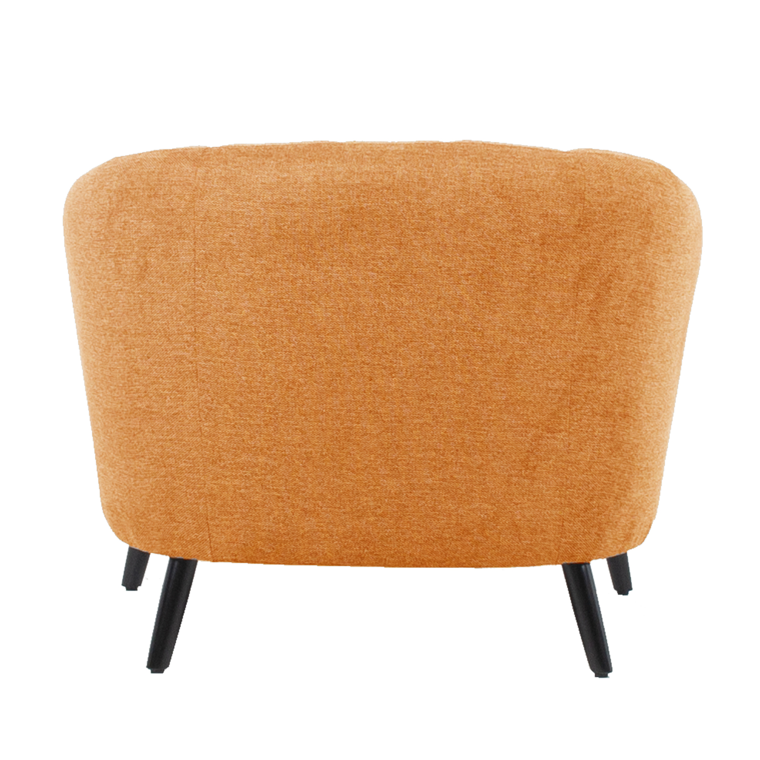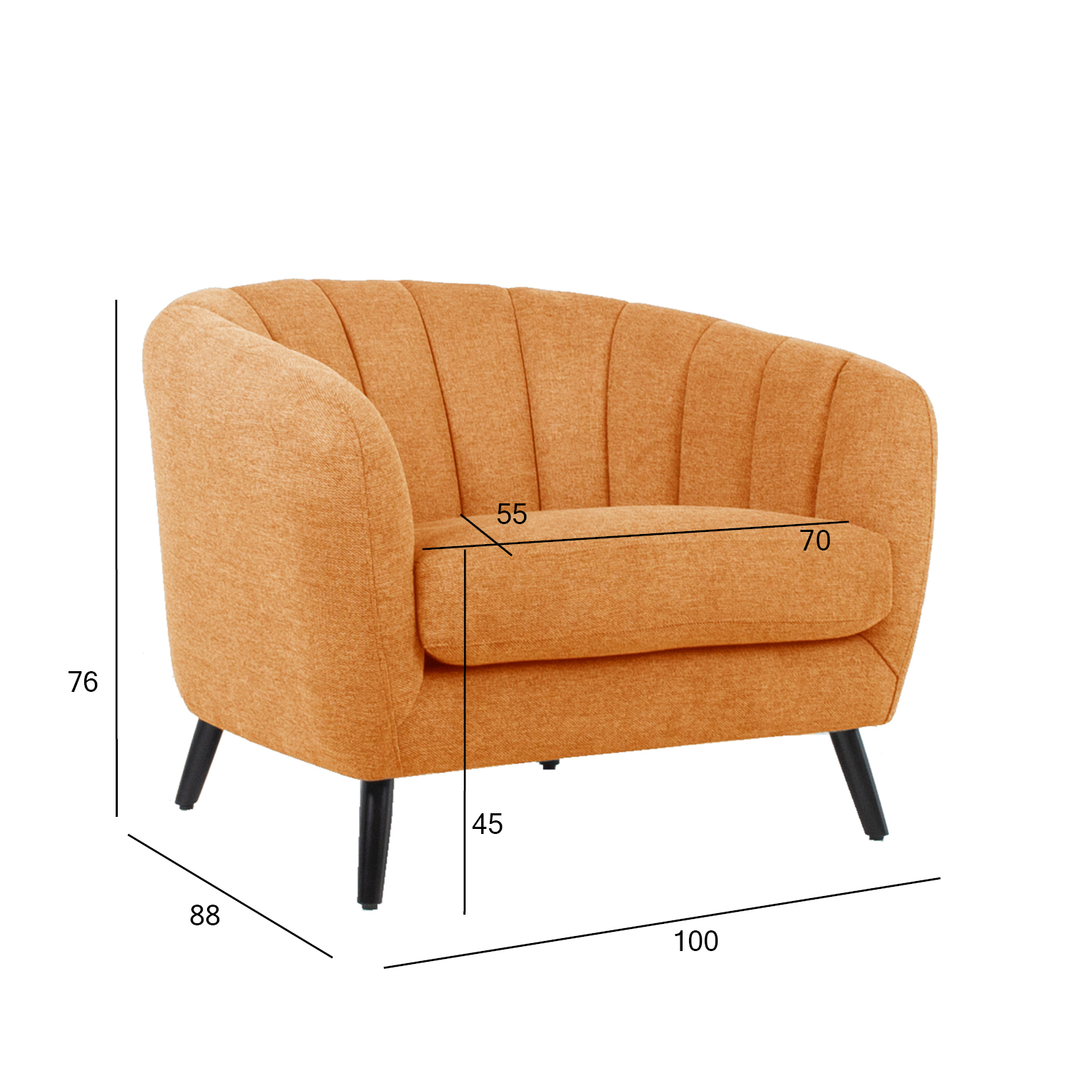 Pagalbinė priemonė MELODY oran˛. Fotelis aptrauktas 100 % poliesterio audiniu. Rėmas pagamintas iš medžio ir faneros. Fotelis turi kišeninę pakabą. Apmušalas: putų poliuretanas. Fotelio kojos pagamintos iš medžio. Sėdynės aukštis 46 cm, sėdynės gylis 57 cm, sėdynės plotis 67 cm priekyje ir 52 cm gale. Gaminio matmenys 100x88xH76 cm.