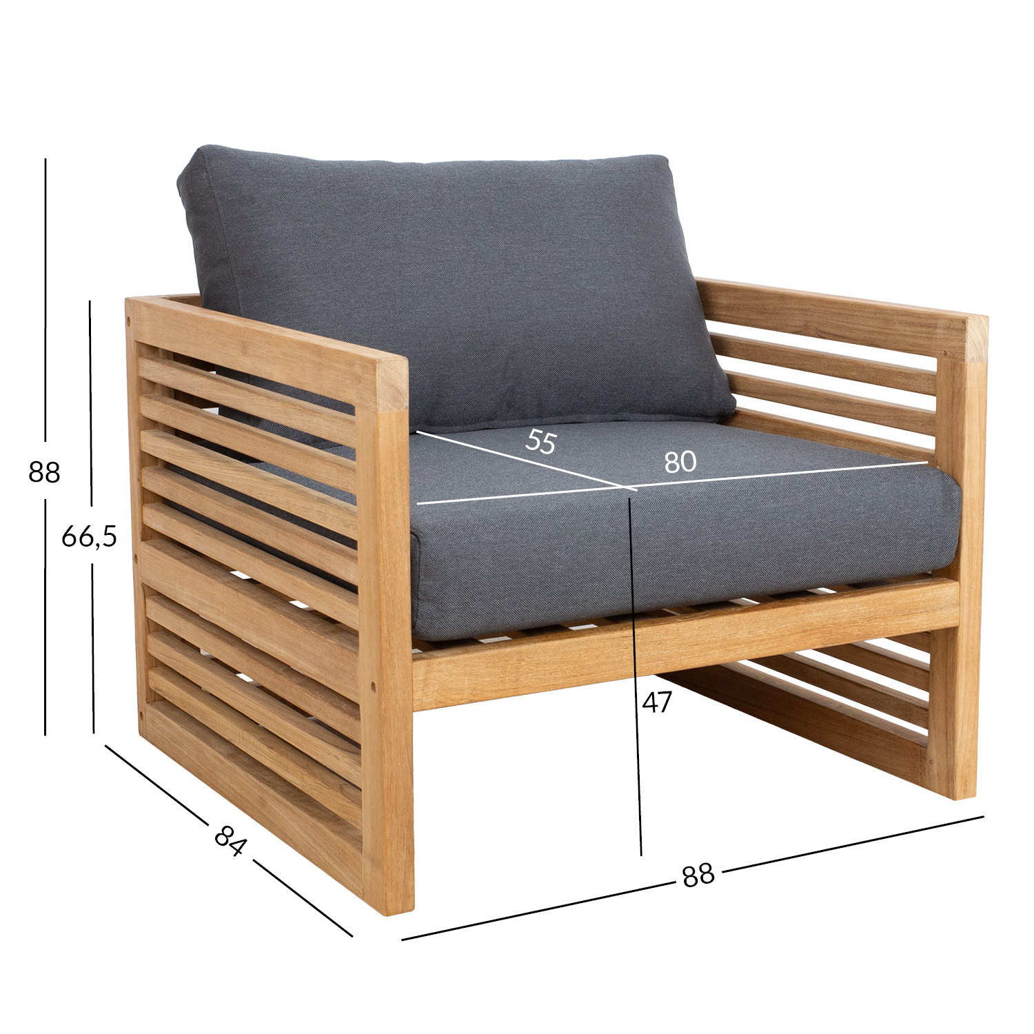 Kėdė pagaminta iš kruopščiai atrinkto brandaus tikmedžio. Smulkiai nušlifuotas medienos paviršius yra visiškai natūralus. Dėl didelio natūralių aliejų kiekio tikmedis yra labai atsparus drėgmei ir medienos pažeidimams, todėl jo nereikia papildomai apdirbti ar alyvuoti. Tikmedis yra labai atsparus įvairioms oro sąlygoms ir ilgus metus išlaikys puikią išvaizdą bei geriausias savybes. Kuo brandesnė mediena, tuo didesnis jos tankis ir alyvos kiekis, tuo ji atsparesnė ir stabilesnė atmosferos poveikiui. Laikui bėgant saulės spinduliai ir drėgmė medienos paviršių nudažo gražią sidabriškai pilką spalvą. Šis spalvos pasikeitimas yra natūralus ir neturi įtakos medienos kokybei.