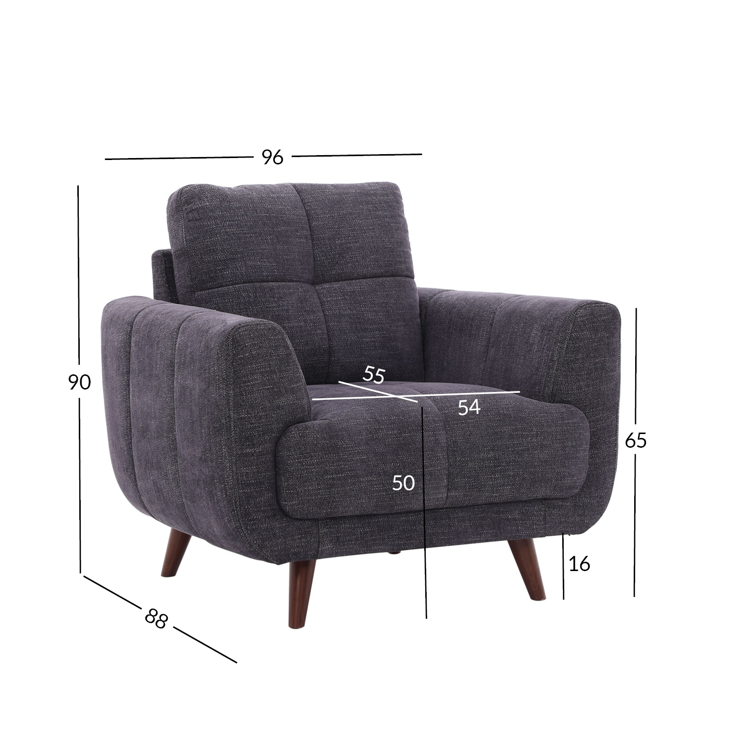 The overall dimensions of the armchair are 96x88xH90cm. Seat width 54cm, seat depth 55cm, seat height 50cm. Armrest height from the ground 65cm.