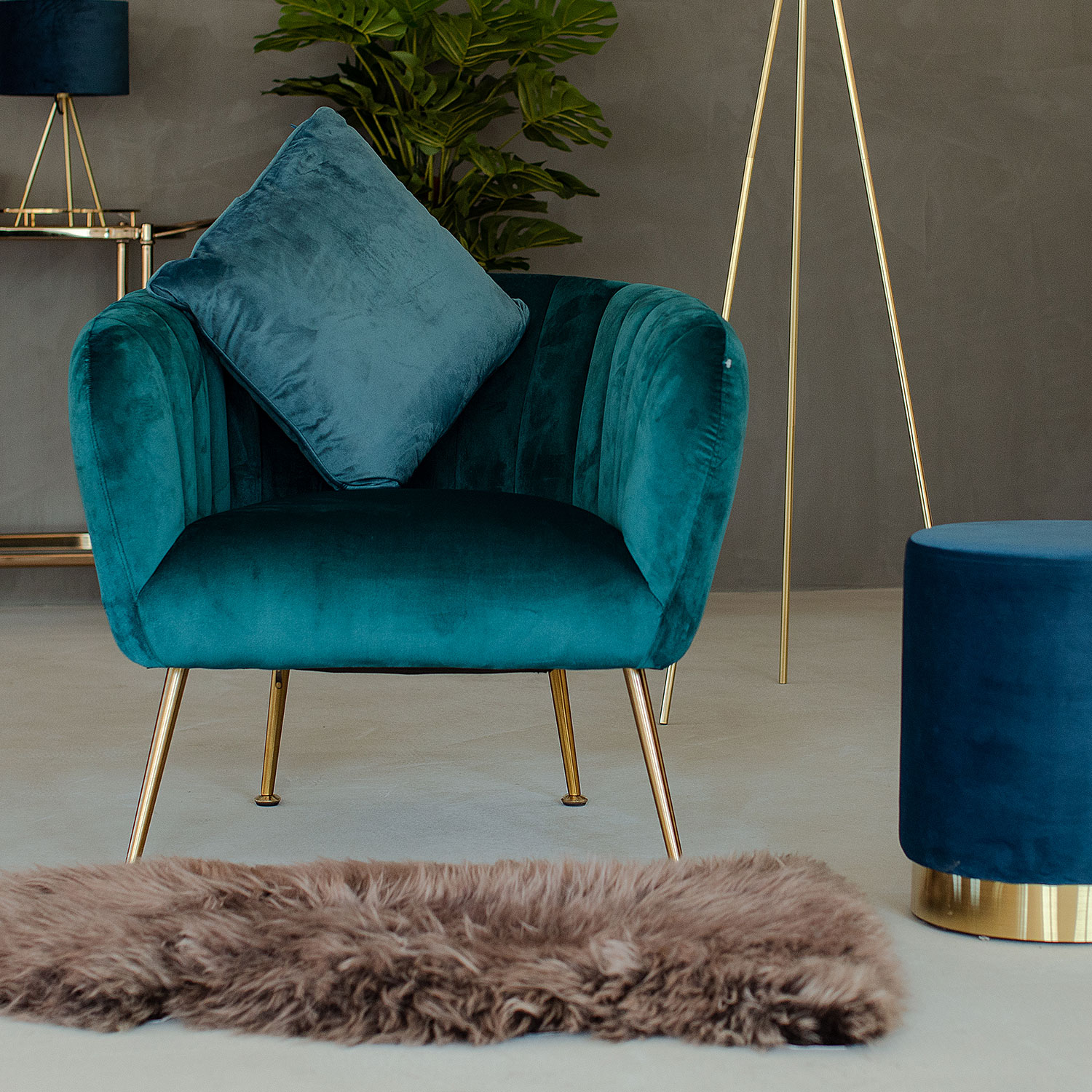 Atraminė kėdė TUCKER jūros žalios spalvos. Kėdė aptraukta jūros žalios spalvos aksomo audiniu. Užvalkalo medžiaga – 100 % poliesterio audinys. Fotelis turi aukso spalvos nerūdijančio plieno kojas. Gaminio matmenys 78x71xH69 cm.