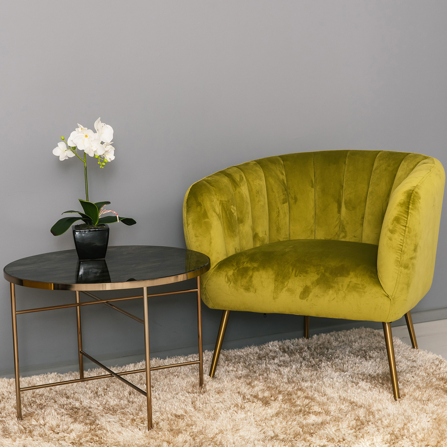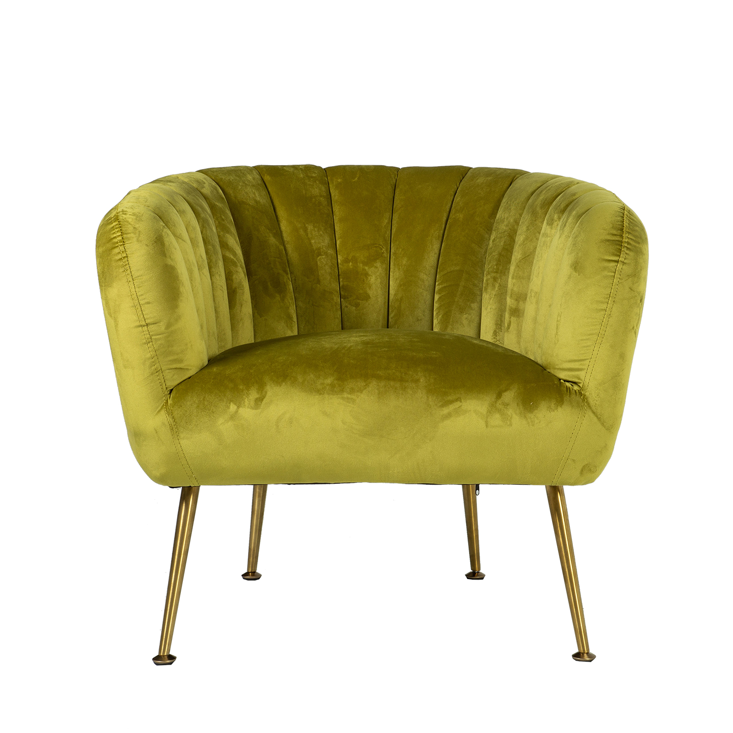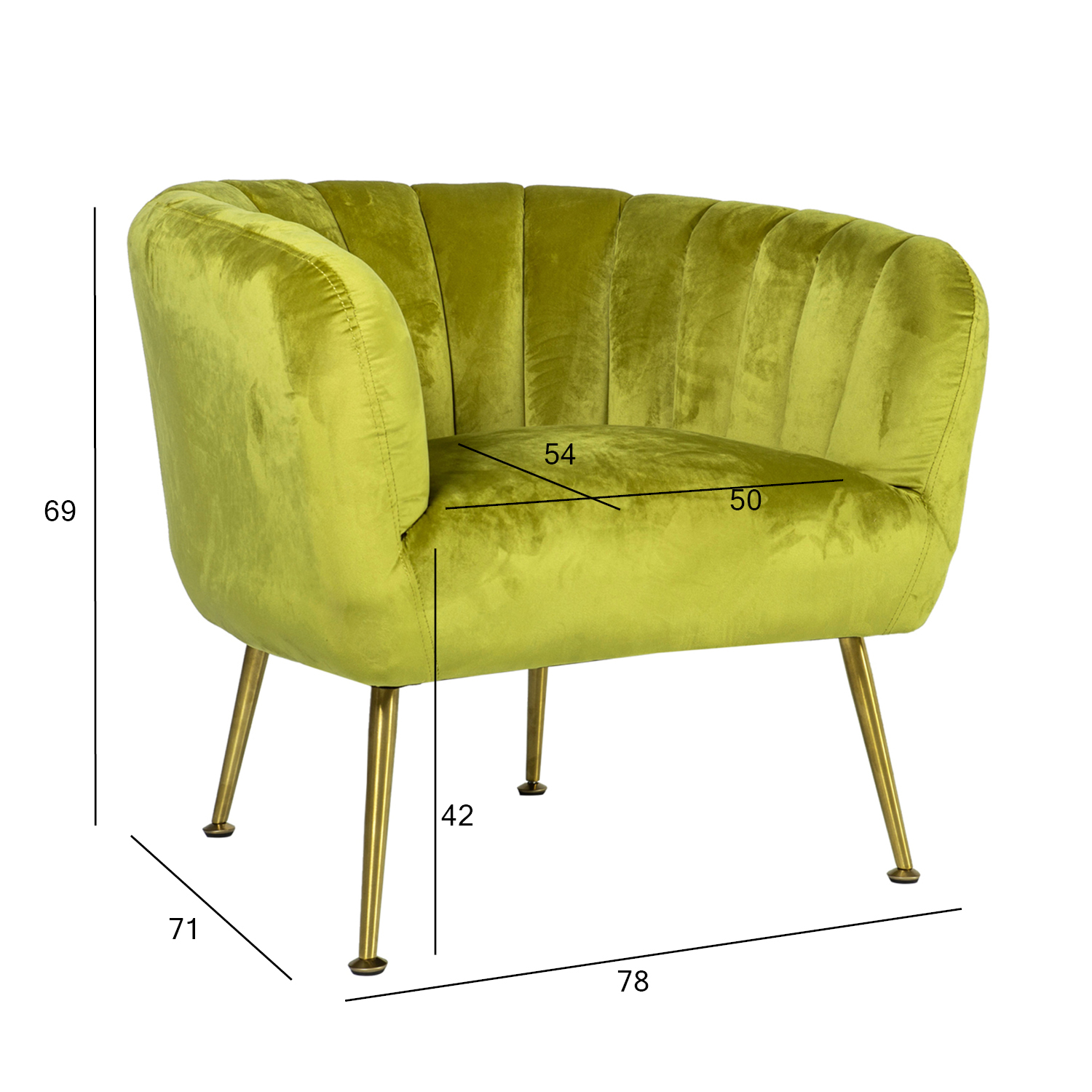 Fotelis TUCKER šviesiai žalios spalvos. Fotelis aptrauktas šviesiai žaliu aksomo audiniu. Užvalkalo medžiagą – 100 % poliesterio audinys. Fotelis turi aukso spalvos nerūdijančio plieno kojas. Gaminio matmenys 78x71xH69 cm.