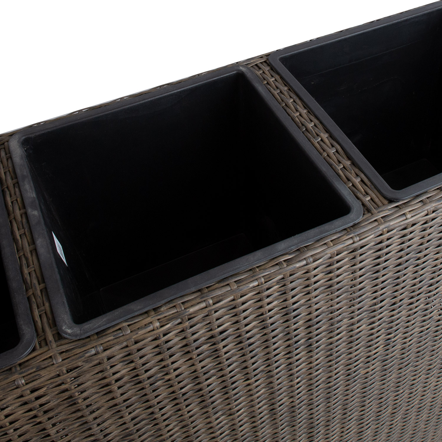 Gėlių dėžutė WICKER 110x39xH88cm, tamsiai ruda. Metalinis karkasas padengtas plastikiniu pynimu. Vidinio plastikinio vazono matmenys 30x30xH30cm. Vidinis vazonas be skylės. Rinkinį sudaro 3 vidiniai vazonai.