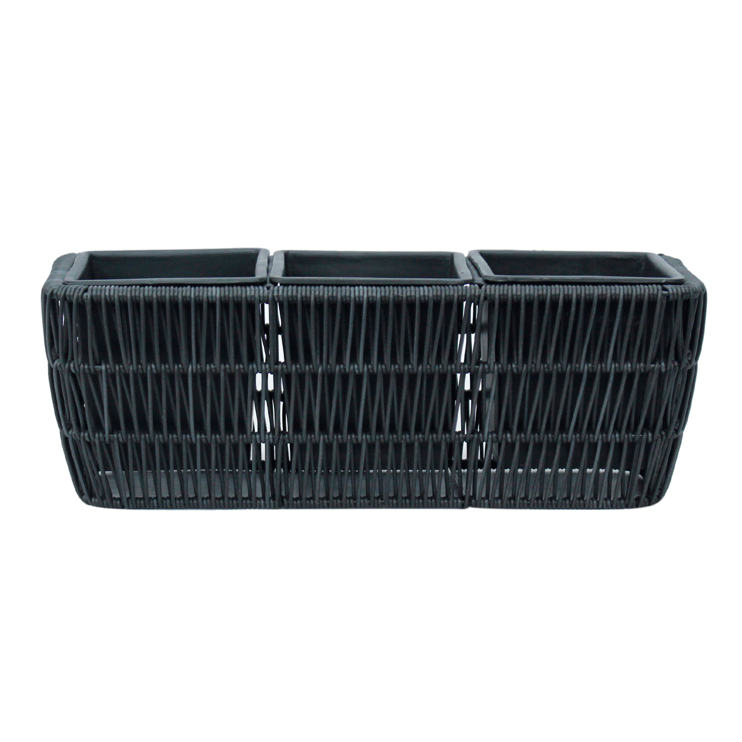 Gėlių dėžutė WICKER 43x16xH16cm, juodos spalvos. Metalinis rėmas, aptrauktas plastikiniu pynimu. Gėlių dėžutės viduje yra 3 plastikiniai vazonai, kurių matmenys 11x11xH12cm. Vazonėliai be skylučių.