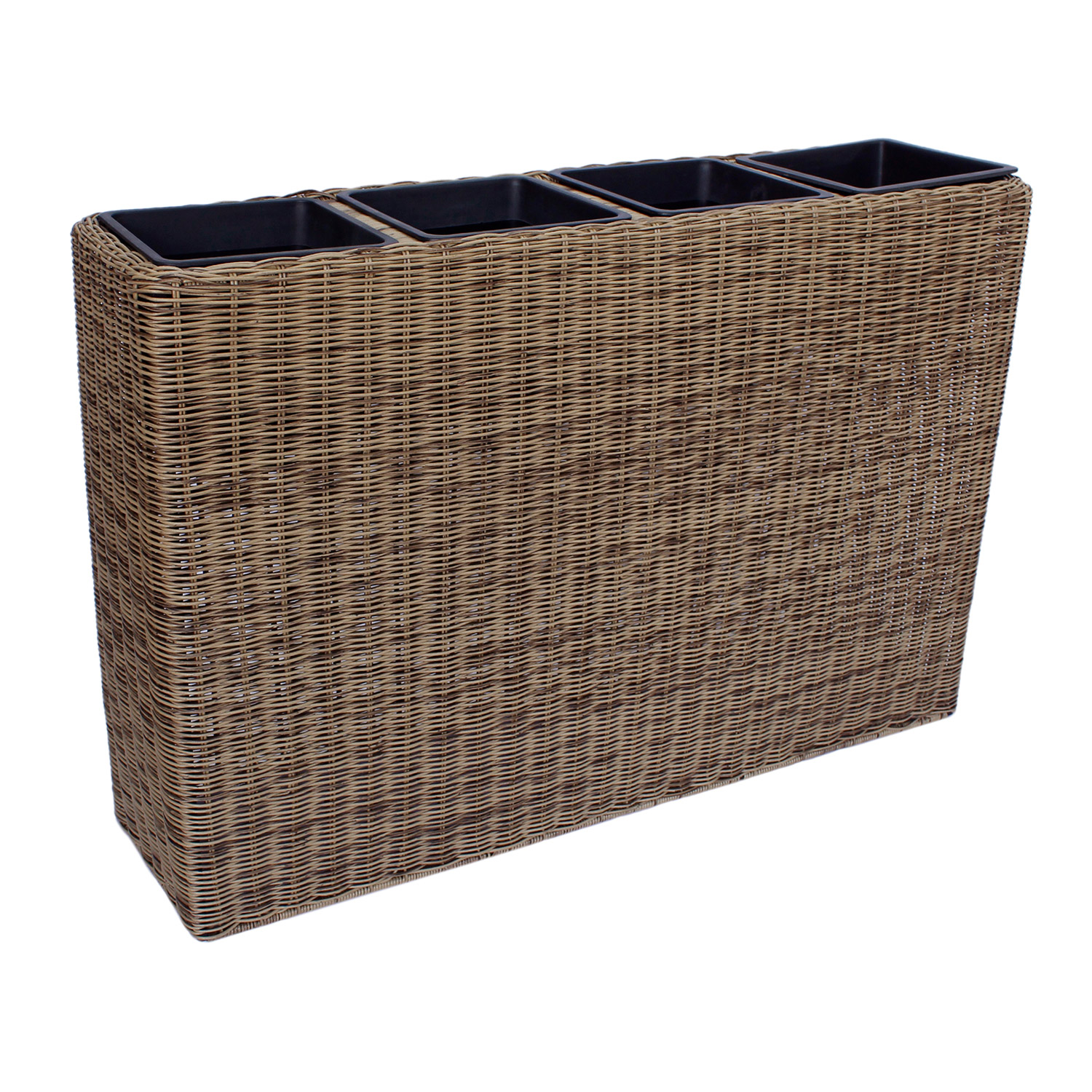 Gėlių dėžutė WICKER 89x24xH60cm, šviesiai raudona. Metalinis karkasas padengtas plastikiniu pynimu. Dėžutės viduje yra 4 plastikiniai vidiniai vazonėliai, kurių matmenys 17,5×17,5xH16cm. Vidiniai vazonai yra be skylučių.