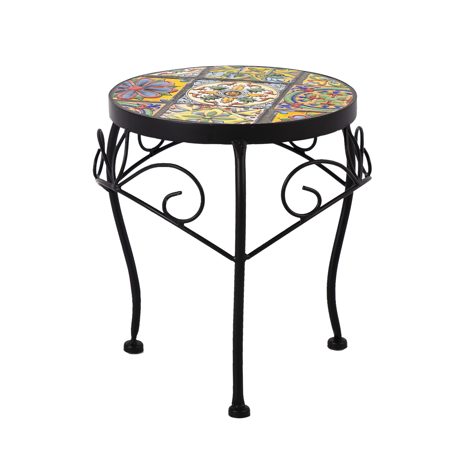 Lillepostamentas MOROKAS D25xH30cm. Viršutinė mozaikinė plytelė padengta Maroko stiliaus spalvotomis keraminėmis plytelėmis. Metalinis pagrindo rėmas ir kojelės padengtos juoda milteline danga. Gaminys tinka naudoti patalpose ir lauke.