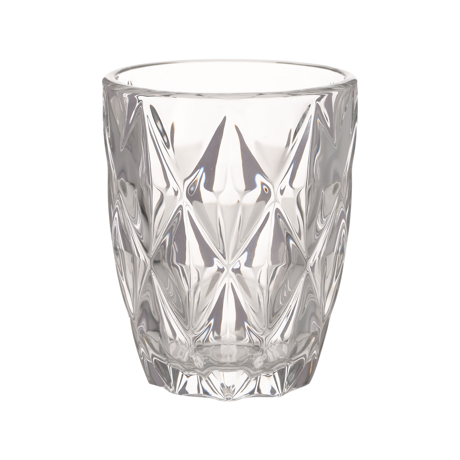 Geriamoji stiklinė žema CORAL 250ml, D8xH10cm, skaidri. Medžiaga: stiklas, įspaustas rombo raštas.