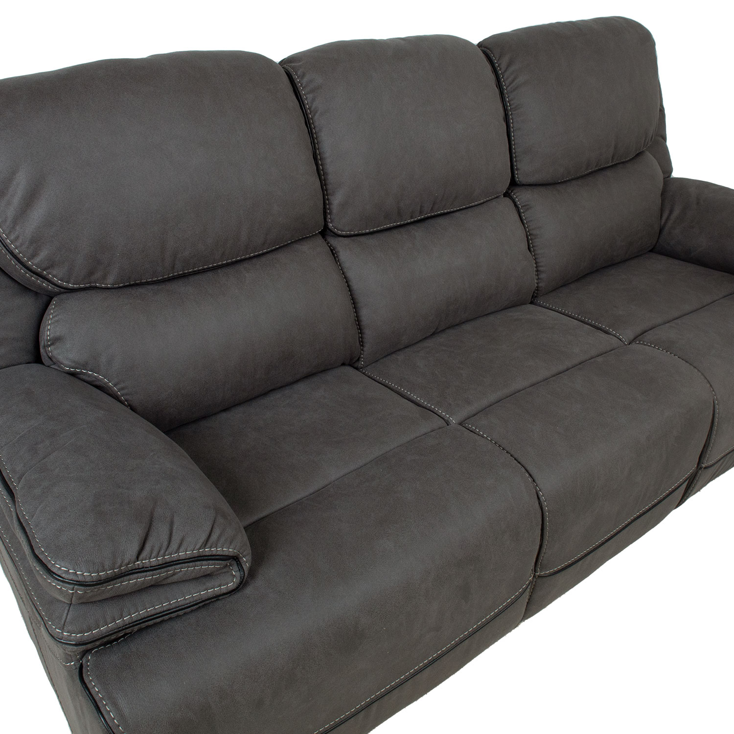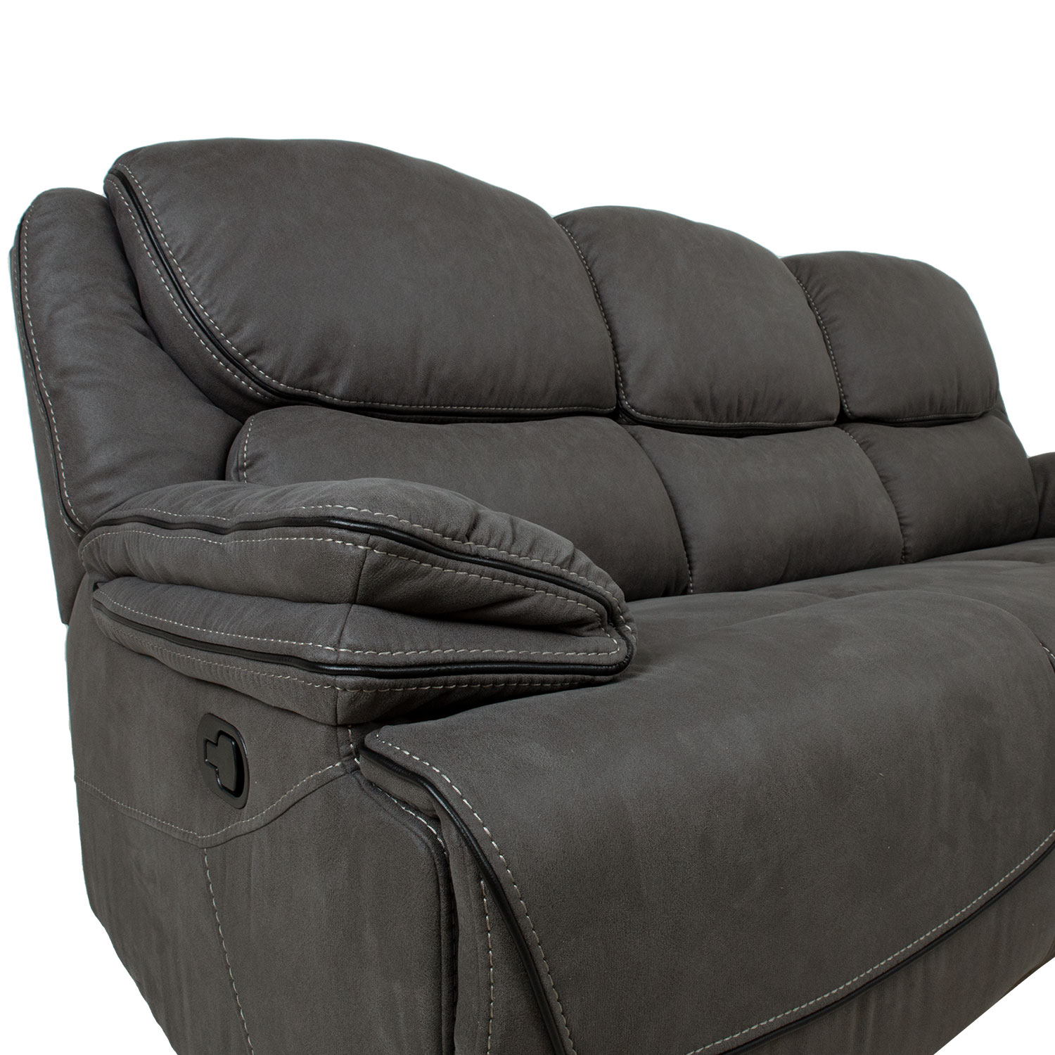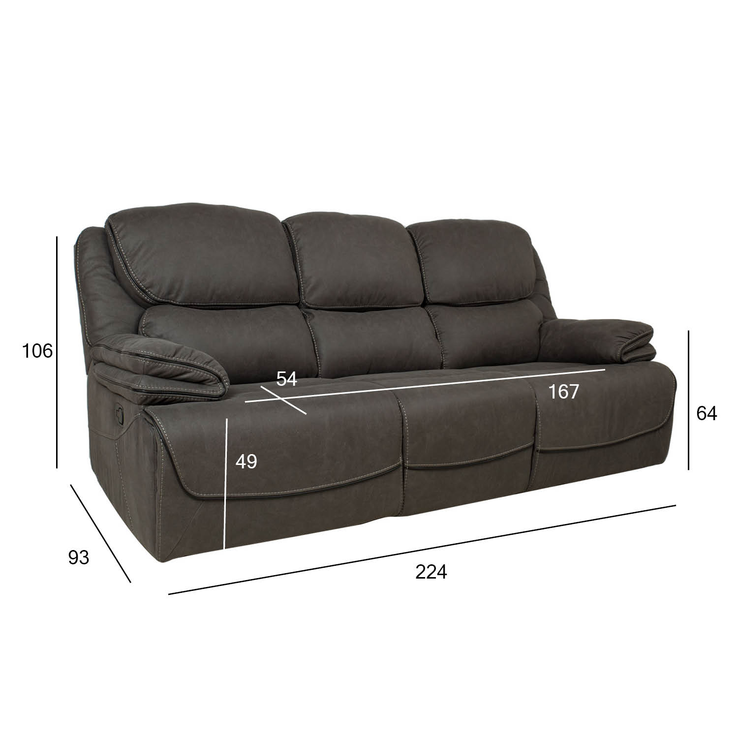 Sofa GORDY 3 sėdimųjų vietų, rankomis valdoma, 224x93xH106cm, pilka. Atlenkiamojo tipo sofa turi rankinį kojų atramos padėties keitimo mechanizmą. Pakėlus kojų atramą, atlošas sklandžiai juda kartu su ja. Norėdami pakelti kojų atramą, patraukite aukštyn išorinėje dešinėje kėdės pusėje esančią svirtį. Stumtelėjus kojų atramą žemyn, ji automatiškai užsifiksuoja pradinėje padėtyje. Vidurinė sėdynė nereguliuojama. Apmušalai: minkštas poliesterio audinys, primenantis dirbtinę odą. Rėmas ir pakaba: fanera, medis, metalas. Kišeninės spyruoklės. Apmušalas: putų poliuretanas, 20-28 kg/m³. Bendrieji matmenys 224x93xH106 cm. Sėdynės plotis 167 cm, sėdynės gylis 54 cm, sėdynės aukštis 49 cm. Atlošo aukštis 69 cm. Porankio aukštis nuo žemės 64 cm.