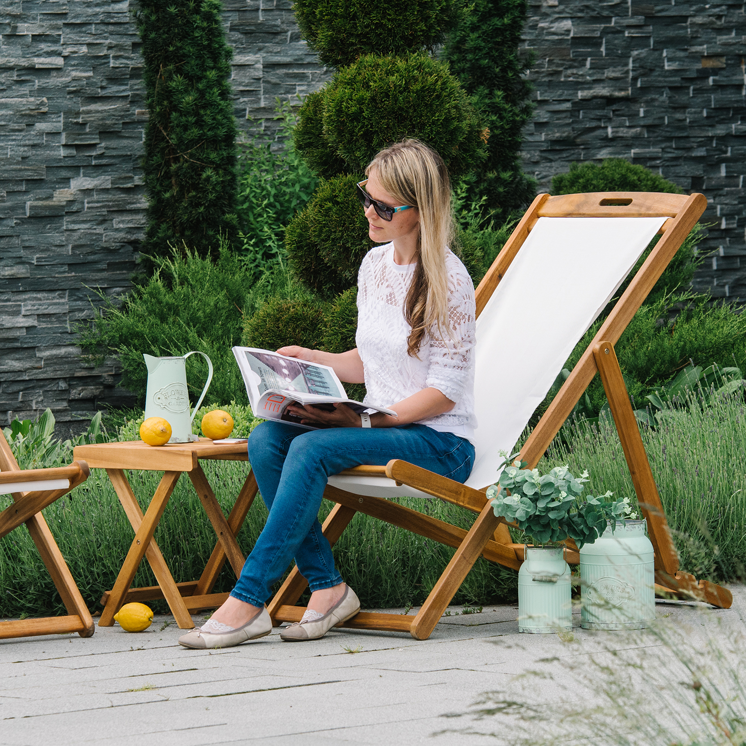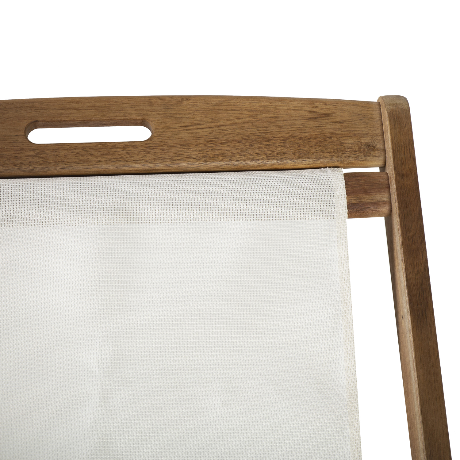 Lamami kėdė FINLAY 62,5x108xH105cm, balta. Sulankstomas, reguliuojamas atlošas, patogus ir praktiškas pasirinkimas! Kėdės karkasas pagamintas iš akacijos medienos ir apdailintas medieną konservuojančia alyva. Kėdės sėdynė pagaminta iš balto tekstilinio audinio, kuris gerai cirkuliuoja orą, greitai džiūsta ir yra lengvai prižiūrimas. Atlošo aukštis reguliuojamas trimis padėtimis. Sulankstytą kėdę lengva nešiotis ar laikyti. Ribinis svoris 100 kg. PRIEŽIŪRA: Pasibaigus vasaros sezonui rekomenduojame sodo baldus laikyti patalpoje. Pasibaigus vasaros sezonui, sodo baldus reikėtų laikyti namuose. Sandėliavimui naudokite sausą ir gerai vėdinamą patalpą. Sandėliavimo metu saugokite baldus nuo tiesioginių saulės spindulių.