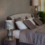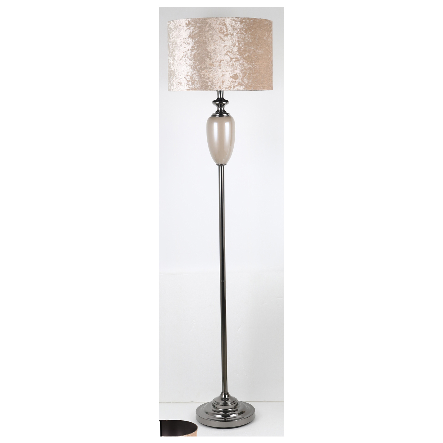 Grindų šviestuvas LUXO, H170 cm, pagrindas: moka perlamutras/stiklas, kupolas: moka aksomas, vidus – tamsiai pilkas atlasinis šilkas. Grindų lempa su įspūdingomis stiklo detalėmis, kurios suteiks jaukumo bet kokiems namams. E27 lemputės pagrindas, maks. šviesos srautas. 60W.