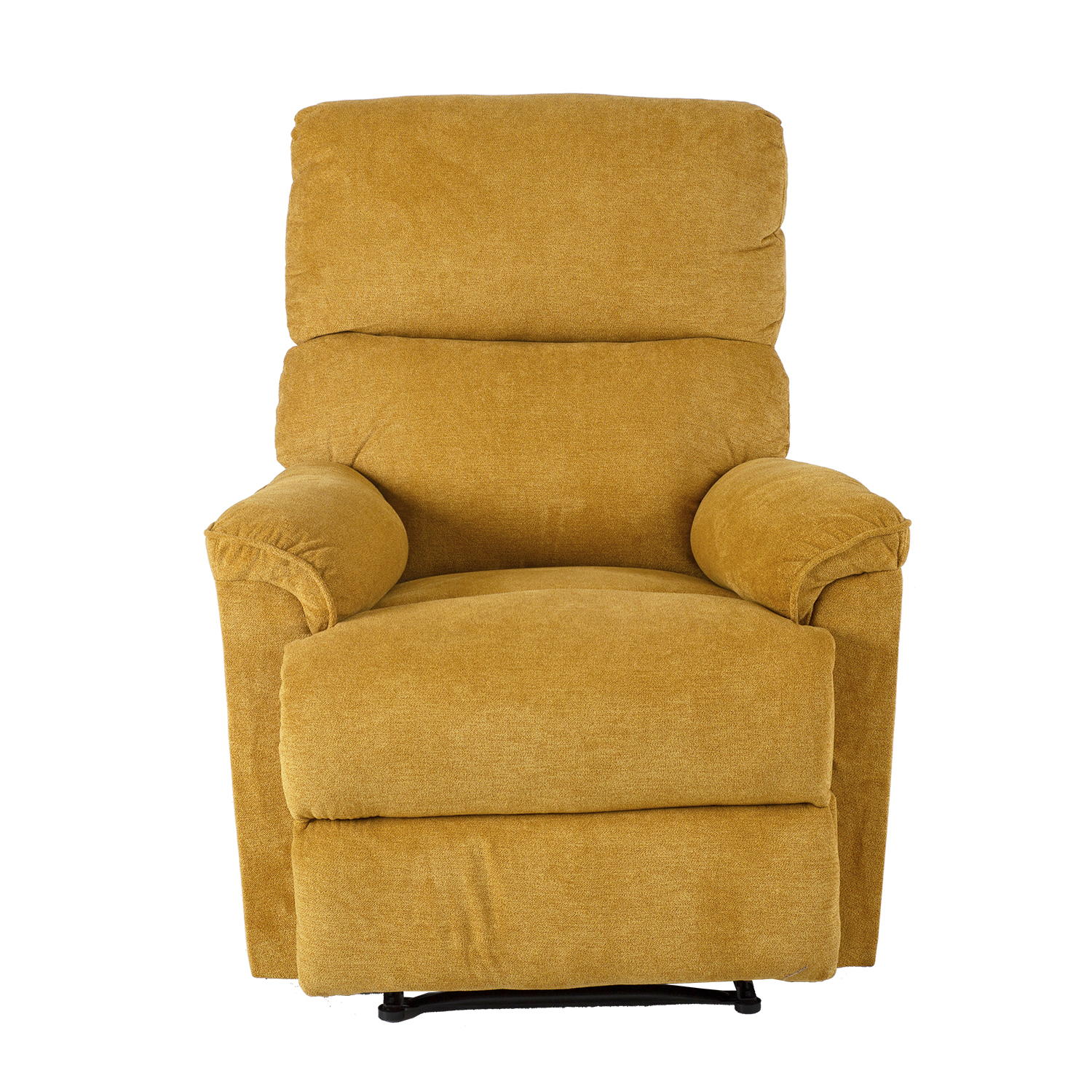 Fotelis GUSTAV manual recliner 80x92xH104cm, geltonos spalvos. Atlenkiamasis fotelis, kojų atramos padėtį galima reguliuoti rankiniu mechanizmu. Pakėlus kojų atlošą atlošas juda tolygiai. Norėdami pakelti kojų atramą, patraukite išorinėje sėdynės pusėje esančią svirtį. Stumtelėjus kojų atramą žemyn, ji automatiškai užsifiksuoja pradinėje padėtyje. Užvalkalo medžiaga: 100 % poliesterio audinys, Martindale vertė nuo 10 000 iki 15 000. Rėmas: medis, metalas. Apmušalas: poliuretano putos 24 kg/m³. Bendrieji fotelio matmenys: 80x92xH104 cm. Sėdynės plotis 43 cm, sėdynės gylis 43 cm, sėdynės aukštis 49 cm. Atlošo aukštis 66 cm. Porankių aukštis nuo žemės 60 cm.