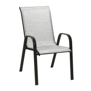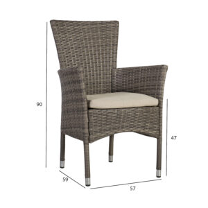 Įrankių BISTRO salė. Kėdės kojos ir rėmas pagaminti iš plieno ir nudažyti pilka milteline danga. Kėdės sėdynė ir atlošas aptraukti rusvai pilku plastikiniu pynute. Bendrieji kėdės matmenys yra 52x58xH73 cm. Ribinis svoris 100 kg. Kėdės yra sukraunamos viena ant kitos, kad jas būtų lengva ir taupant vietą laikyti. Gaminys yra patvarus kintamomis oro sąlygomis ir lengvai prižiūrimas. PRIEŽIŪRA: pasibaigus vasaros sezonui, rekomenduojame sodo baldus laikyti patalpoje. Pasibaigus vasaros mėnesiams, sodo baldus reikėtų laikyti namuose. Sandėliavimui naudokite sausą ir gerai vėdinamą patalpą.