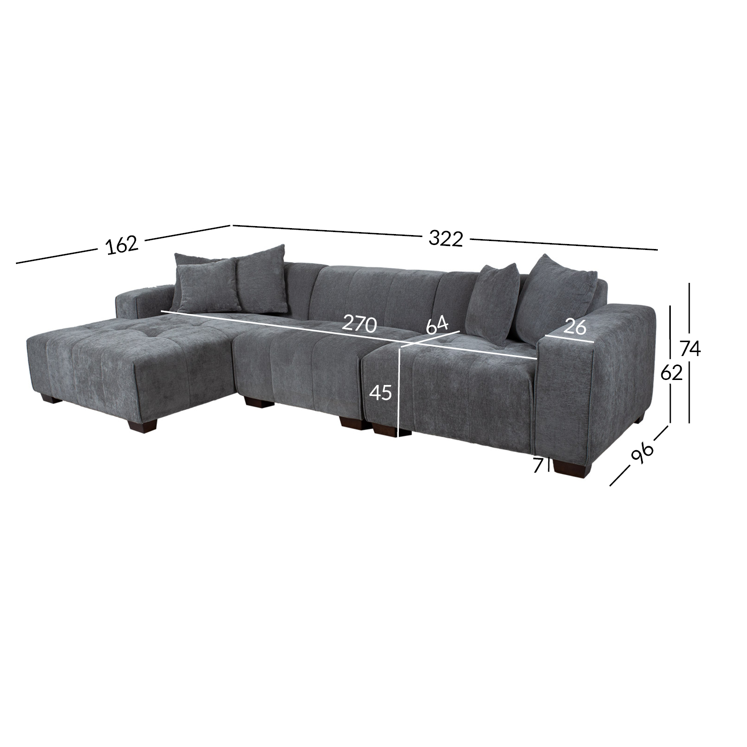 Kampinė sofa-lova DAHLIA kairysis kampas, pilka. Madinga minimalistinio stiliaus kampinė sofa, puikiai tinkanti moderniam interjerui. Rėmas pagamintas iš pušies medienos. Apmušalai pagaminti iš aukštos kokybės putų poliuretano. Sėdynės pagrindui reikiamą atramą ir elastingumą suteikia aukštos kokybės plieninės zigzaginės spyruoklės. Sofa visiškai aptraukta aksominiu minkštu audiniu. Užvalkalo medžiaga: 79 % poliesteris, 21 % viskozė. Sofos matmenys: 322×162/96xH74 cm. Sėdimosios dalies plotis 270 cm, sėdimosios dalies gylis 64 cm, sėdimosios dalies aukštis 45 cm. Porankių aukštis nuo žemės 62 cm, porankių plotis 26 cm. Sofa turi tamsaus medžio kojas H7cm. Į komplektą įeina 3+2 sofos pagalvėlės, kurių matmenys 55x55cm ir 42x42cm.