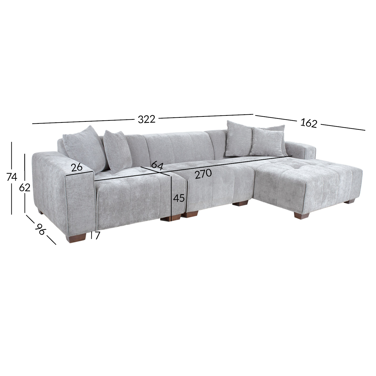Kampinė sofa DAHLIA, dešinysis kampas, šviesiai pilka. Madinga minimalistinio stiliaus kampinė sofa, puikiai tinkanti moderniam interjerui. Rėmas pagamintas iš pušies medienos. Apmušalai pagaminti iš aukštos kokybės putų poliuretano. Sėdynės pagrindui reikiamą atramą ir elastingumą suteikia aukštos kokybės plieninės zigzaginės spyruoklės. Sofa visiškai aptraukta aksominiu minkštu audiniu. Užvalkalo medžiaga: 79 % poliesteris, 21 % viskozė. Sofos matmenys: 322×96/162xH74 cm. Sėdimosios dalies plotis 270 cm, sėdimosios dalies gylis 64 cm, sėdimosios dalies aukštis 45 cm. Porankių aukštis nuo žemės 62 cm, porankių plotis 26 cm. Sofa turi tamsaus medžio kojas H7cm. Į komplektą įeina 3+2 sofos pagalvėlės, kurių matmenys 55x55cm ir 42x42cm.