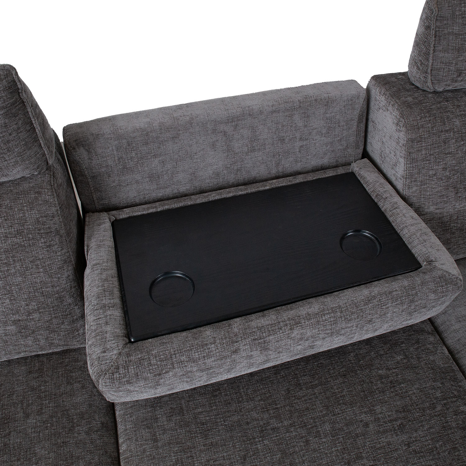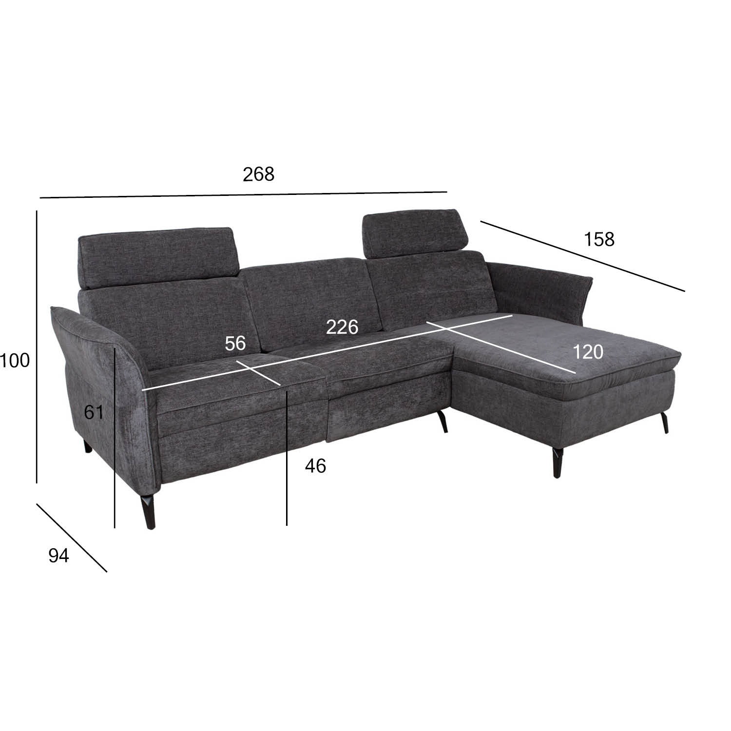 Kampinė sofa DAYTON PN, elektrinė, tamsiai pilka. Šiuolaikinių minkštųjų baldų funkcionalumas yra toks pat svarbus kaip ir išvaizda bei patogumas. Rankiniu mechanizmu sofos galvos atlošai gali būti pakeliami ir nuleidžiami. Kojų atramų padėtis reguliuojama elektriniu mechanizmu. Vidurinės sėdynės atlošą galima paversti patogiu pagalbiniu staliuku su puodelių laikikliais. Sofos rėmas pagamintas iš medžio ir faneros. Apmušalai pagaminti iš putų poliuretano. Sofa visiškai aptraukta poliesterio audiniu. Bendrieji sofos matmenys yra 286×94/157xH100 cm. Sofa turi metalines kojeles.