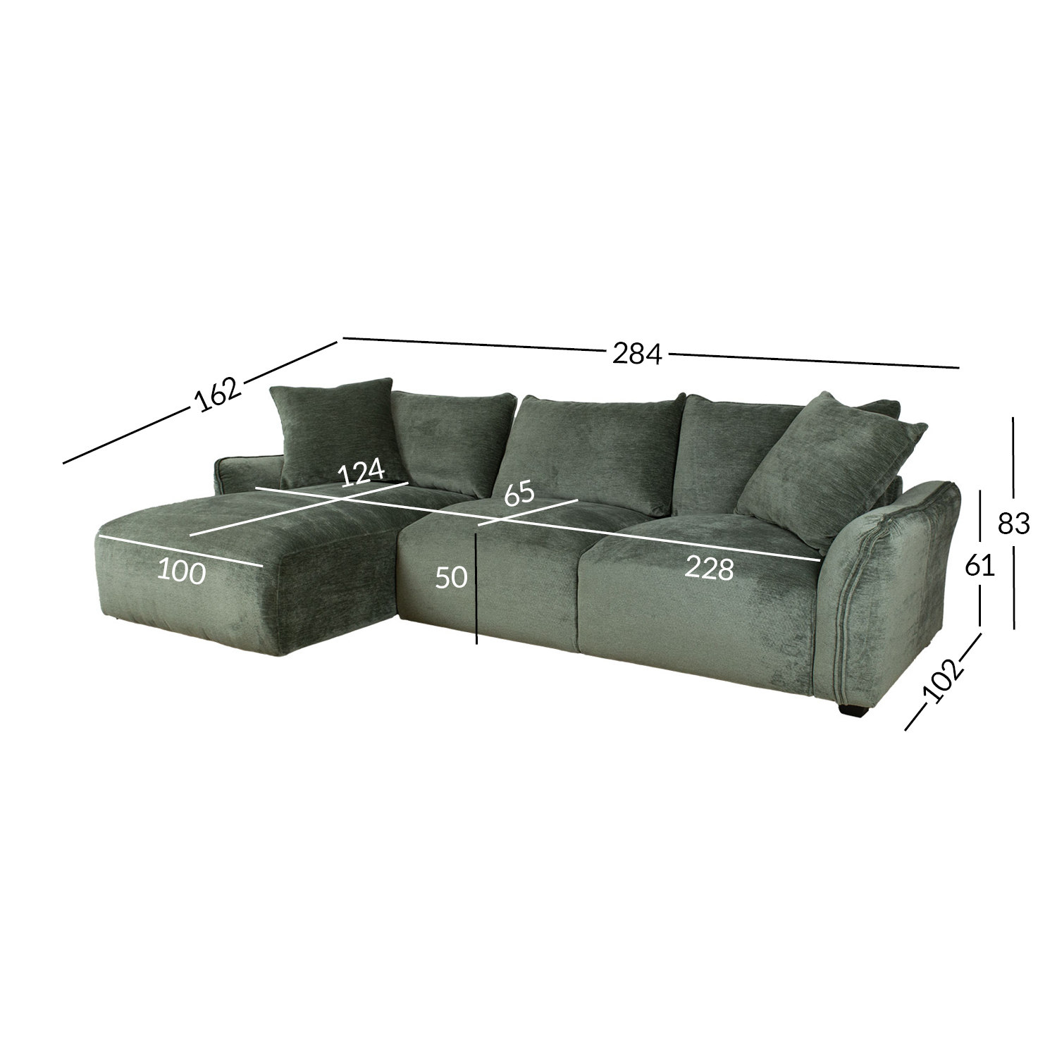 The overall dimensions of the sofa are 284×162/102xH83cm. Seat width 154+74cm, seat depth 65/124cm. Seat height 50cm. Armrest height from the ground 61cm.