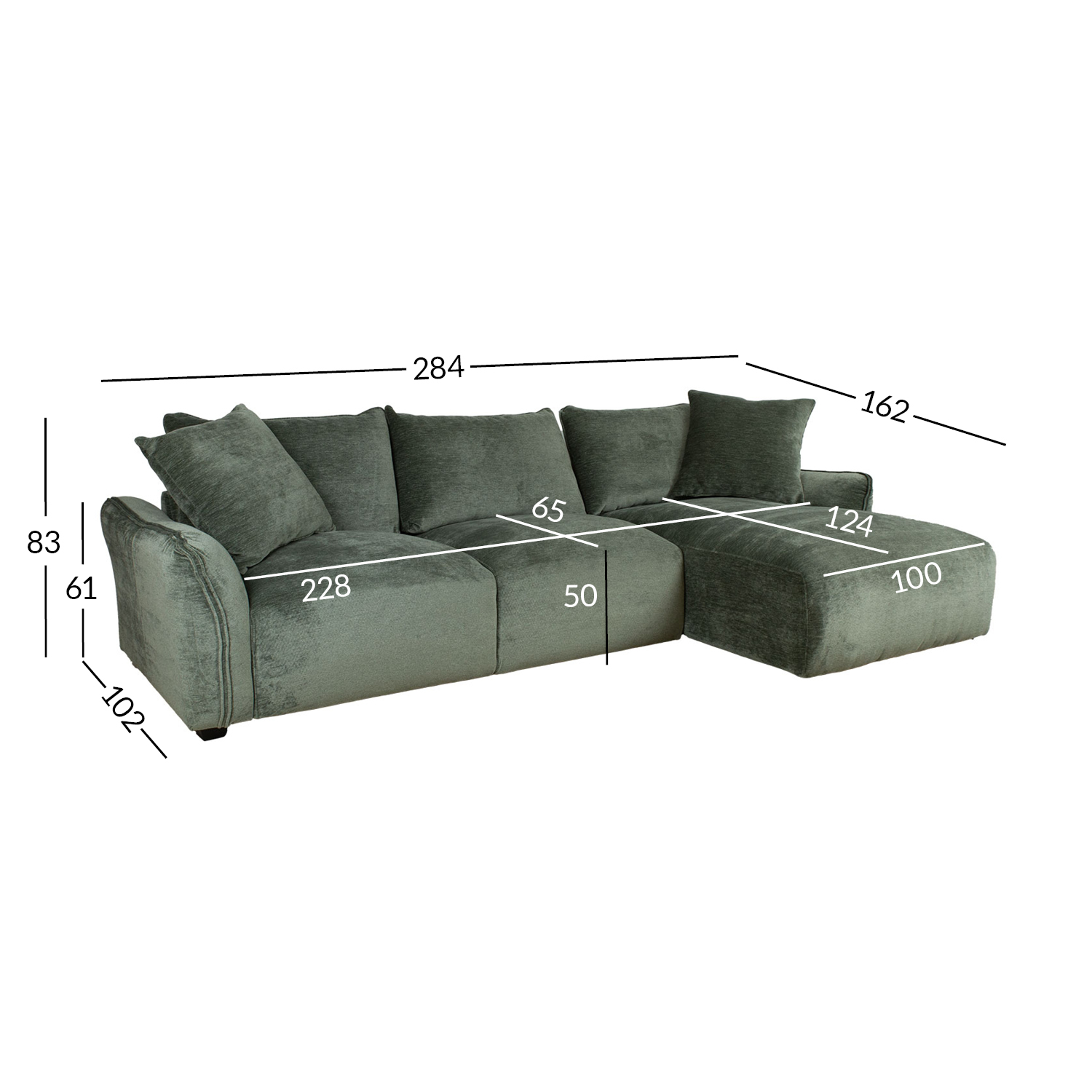 The overall dimensions of the sofa are 284×102/162xH83cm. Seat width 154+74cm, seat depth 65/124cm. Seat height 50cm. Armrest height from the ground 61cm.